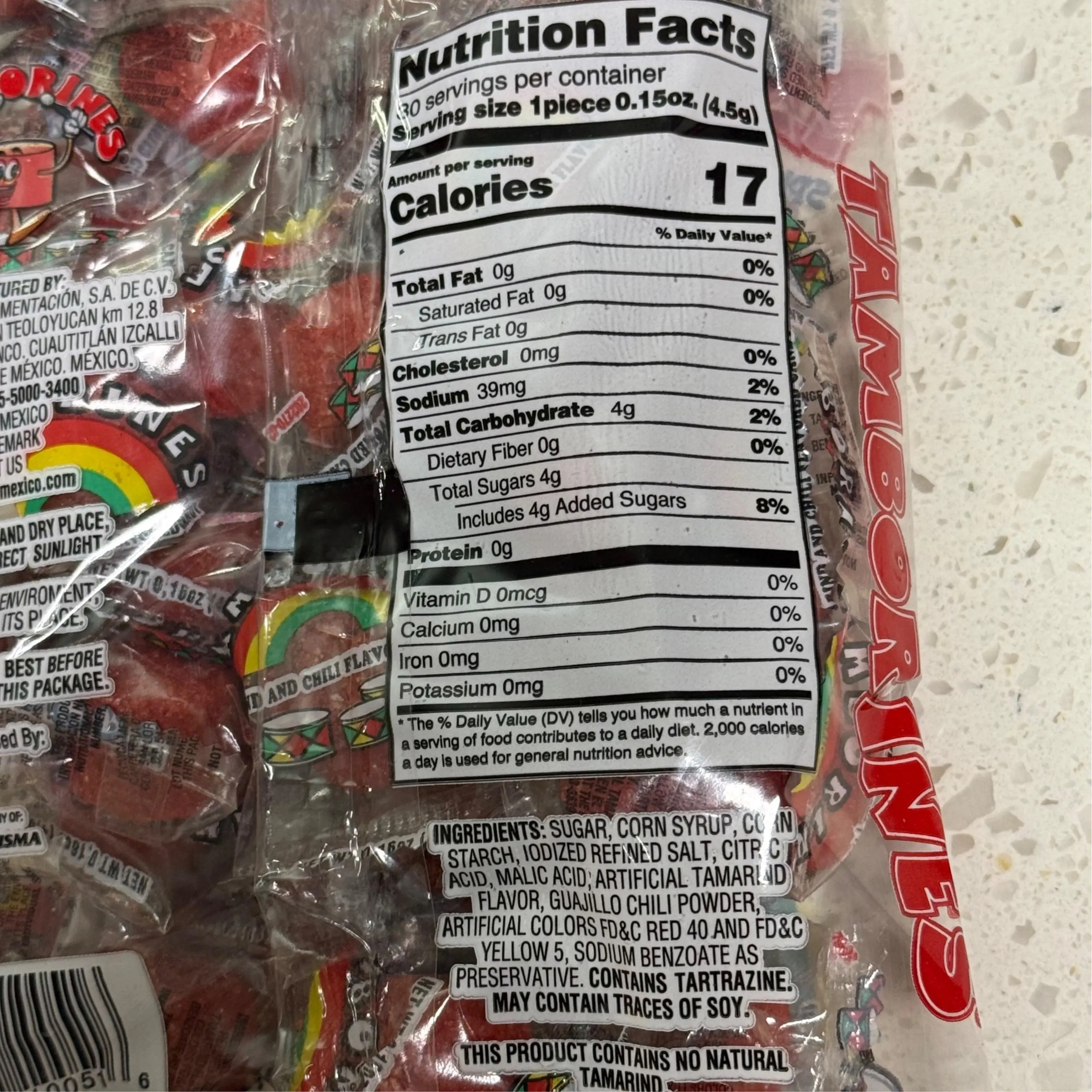 Ingredients (listed in descending order by weight): Sugar, corn syrup, corn starch, iodized salt, citric acid, malic acid, artificial tamarind flavor, chili powder, artificial colors (FD&C Red 40, FD&C Yellow 5), sodium benzoate as preservative