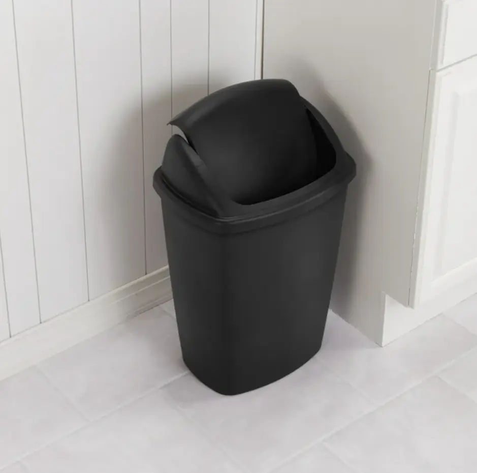 The Sterilite Kitchen Trash Can, 7.5 Gallon Plastic Garbage Bin with Swing Top Lid, Black combines modern style with everyday convenience. Its SwingTop lid opens effortlessly when lightly pushed and features an integrated handle that allows the lid to lock into place for easy disposal of larger items. Even when the trash can is flush against a wall or cabinet, the lid fully swings open. When closed, the lid conceals the trash for a neat, clean look. Designed to hold a standard 8-gallon trash liner, this durable plastic garbage bin has an easy-to-clean textured finish. This SwingTop trash can makes cleanup quick and simple. Ideal for kitchens, offices, or garages.