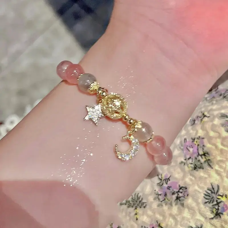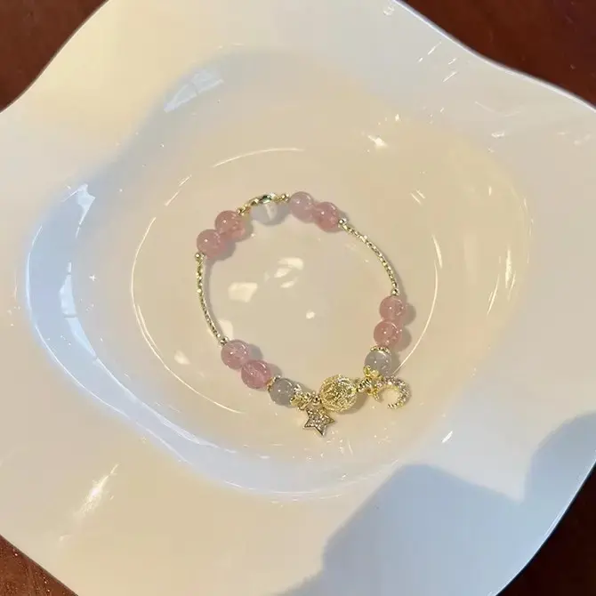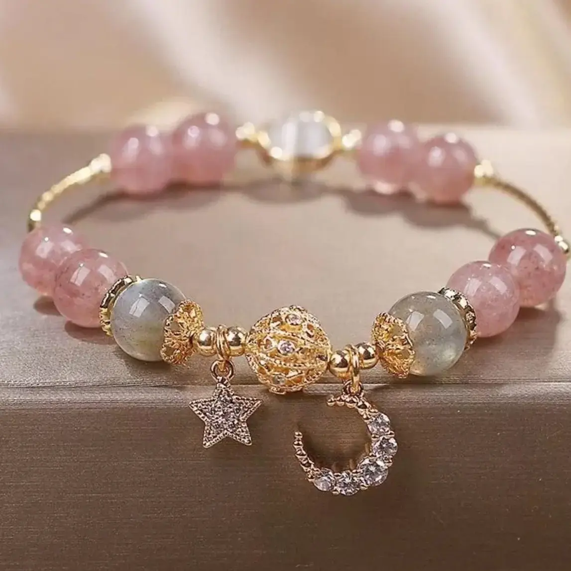 ·Symbolism: Strawberry crystal is considered a symbol of love, attracting and enhancing love luck. Gray moonstone, on the other hand, is believed to help balance emotions and bring calm and serenity. The star and moon elements, on the other hand, symbolize endless possibilities and the pursuit of dreams. The addition of golden-colored beads represents wealth and prosperity.