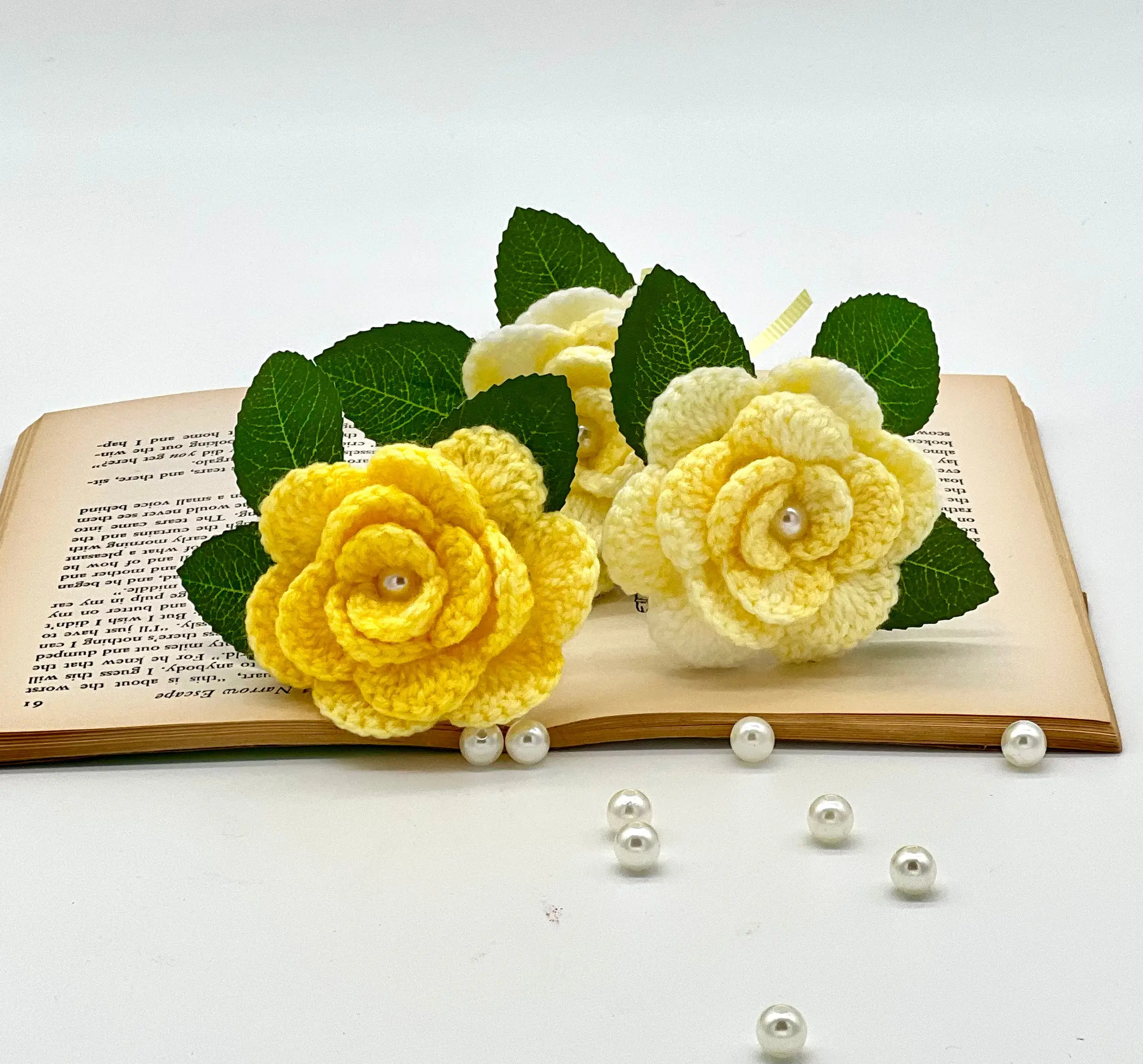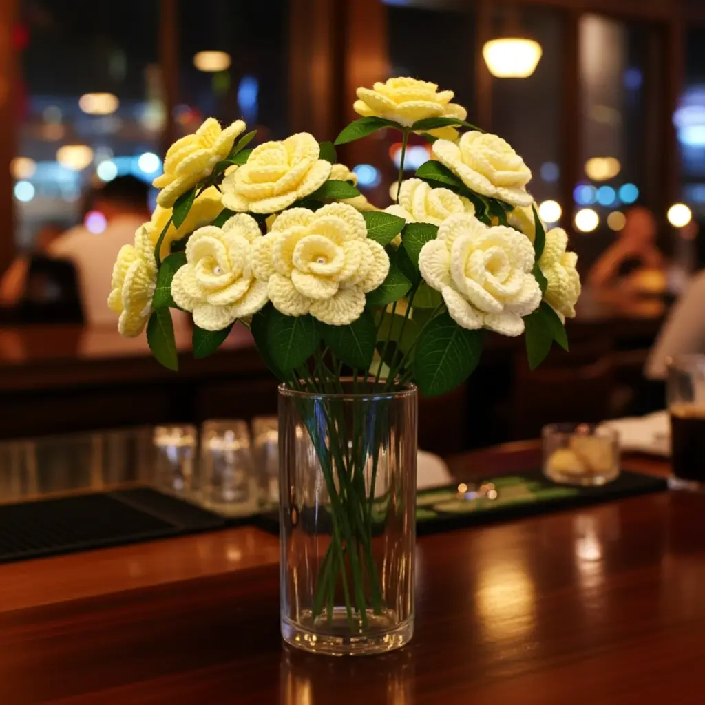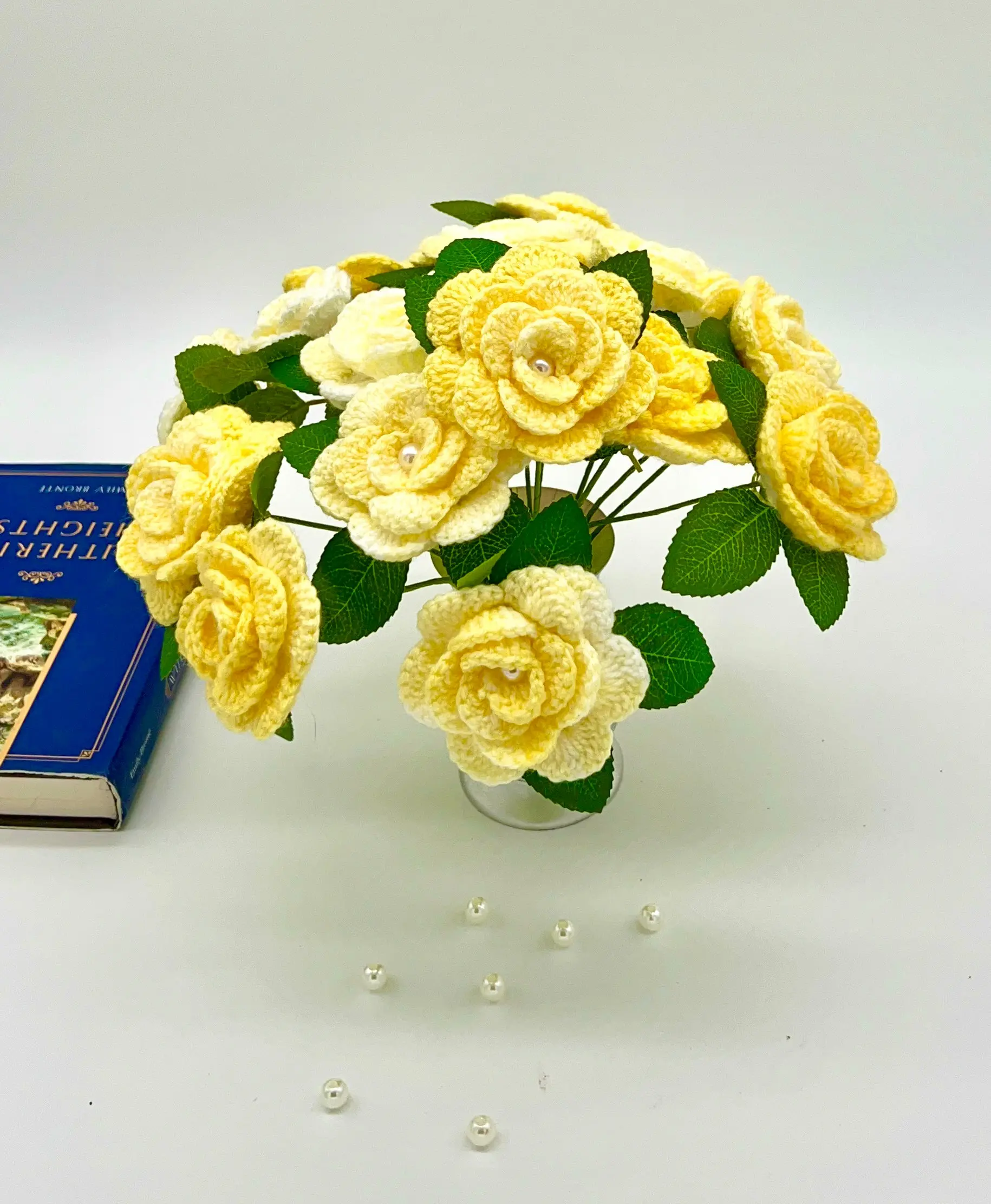 Each yellow rose is individually hand-crocheted from premium soft yarn and finished with a delicate pearl bead at the center for an elegant touch. With bendable wire stems and realistic plastic leaves, this bouquet can be styled to fit any vase or display — and stays beautiful indefinitely.