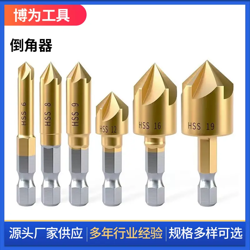 This set includes five-blade chamfering knives, a wood countersink drill, and a deburring tool. Ideal for precision work, it offers a versatile hole opener set. Each tool is labeled with its size: HSS 6, HSS 8, HSS 9, HSS 12, HSS 16, and HSS 19. Choose the right size for your project, ensuring a professional finish.