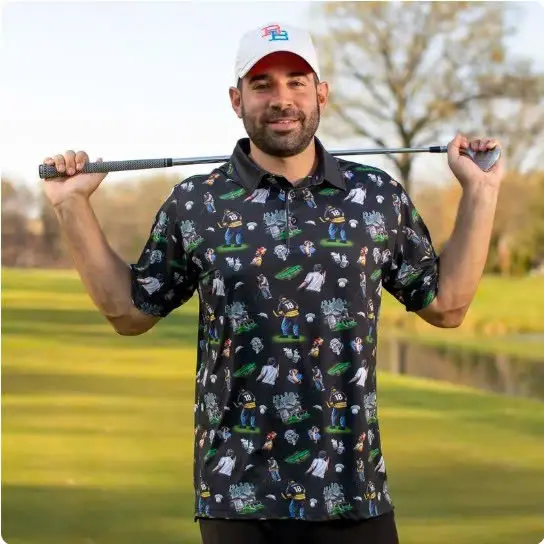 Happy Gilmore “It’s All in the Hips” All-Day Polo Shirt – Funny Golf Quote Graphic Polo, Breathable Performance Fabric, Casual Golf & Summer Travel Shirt for Men