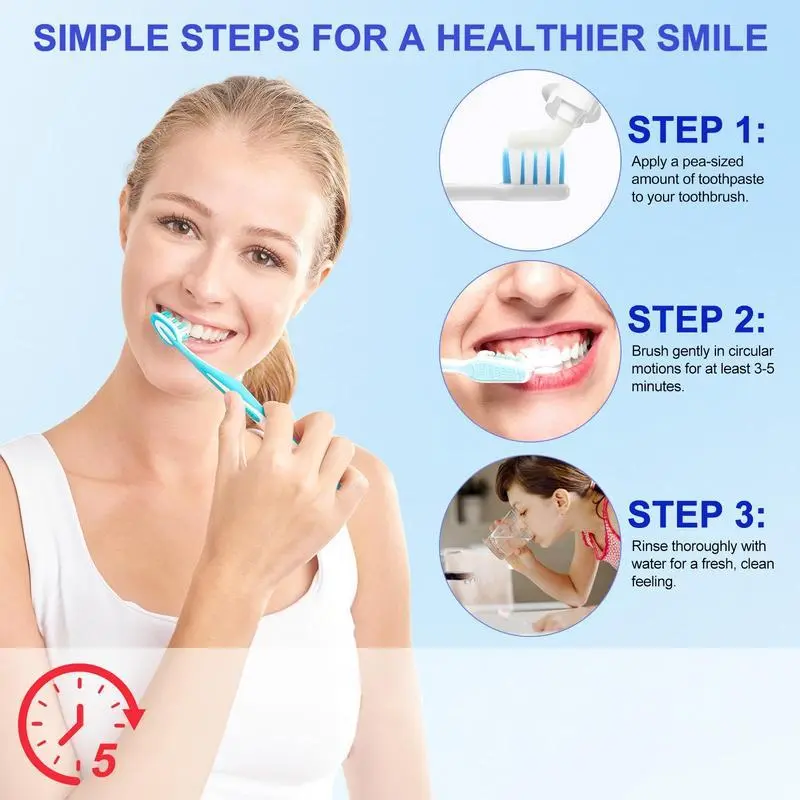 Gently brush teeth and gaps for 2–3 minutes