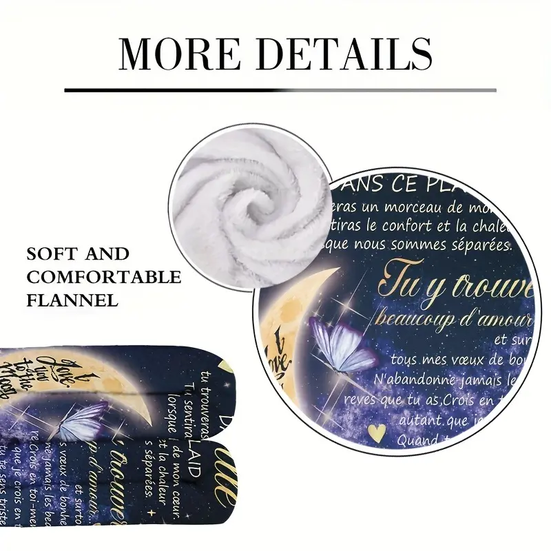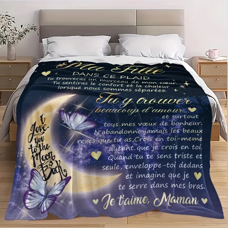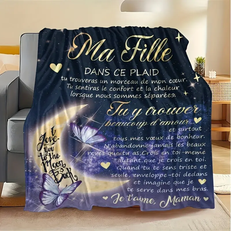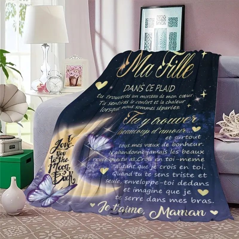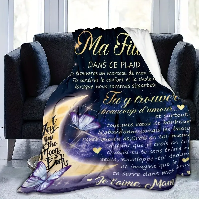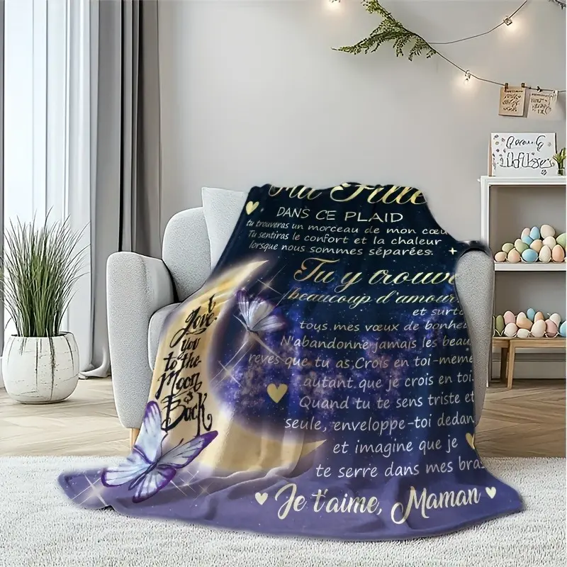 To My Daughter Ma Fille French Inspirational Gift Soft Cozy Flannel Blanket Glowing Moon Butterfly Starry Sky Print Plush Throw Warm Fuzzy Bedroom Sofa Blanket Perfect Birthday Graduation Holiday Gift for Daughter from Mom Home Decor