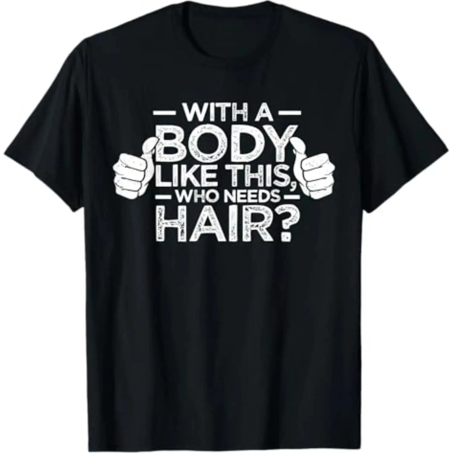 This premium tee features a bold, vintage-distressed print of the iconic line "WITH A BODY LIKE THIS, WHO NEEDS HAIR?", paired with playful thumbs-up hand graphics that perfectly capture the lighthearted, self-assured spirit of bald men everywhere. The high-quality, fade-resistant ink ensures the sharp, eye-catching design stays vibrant, crisp, and free from cracking, peeling, or dulling, even after countless washes and years of daily wear.