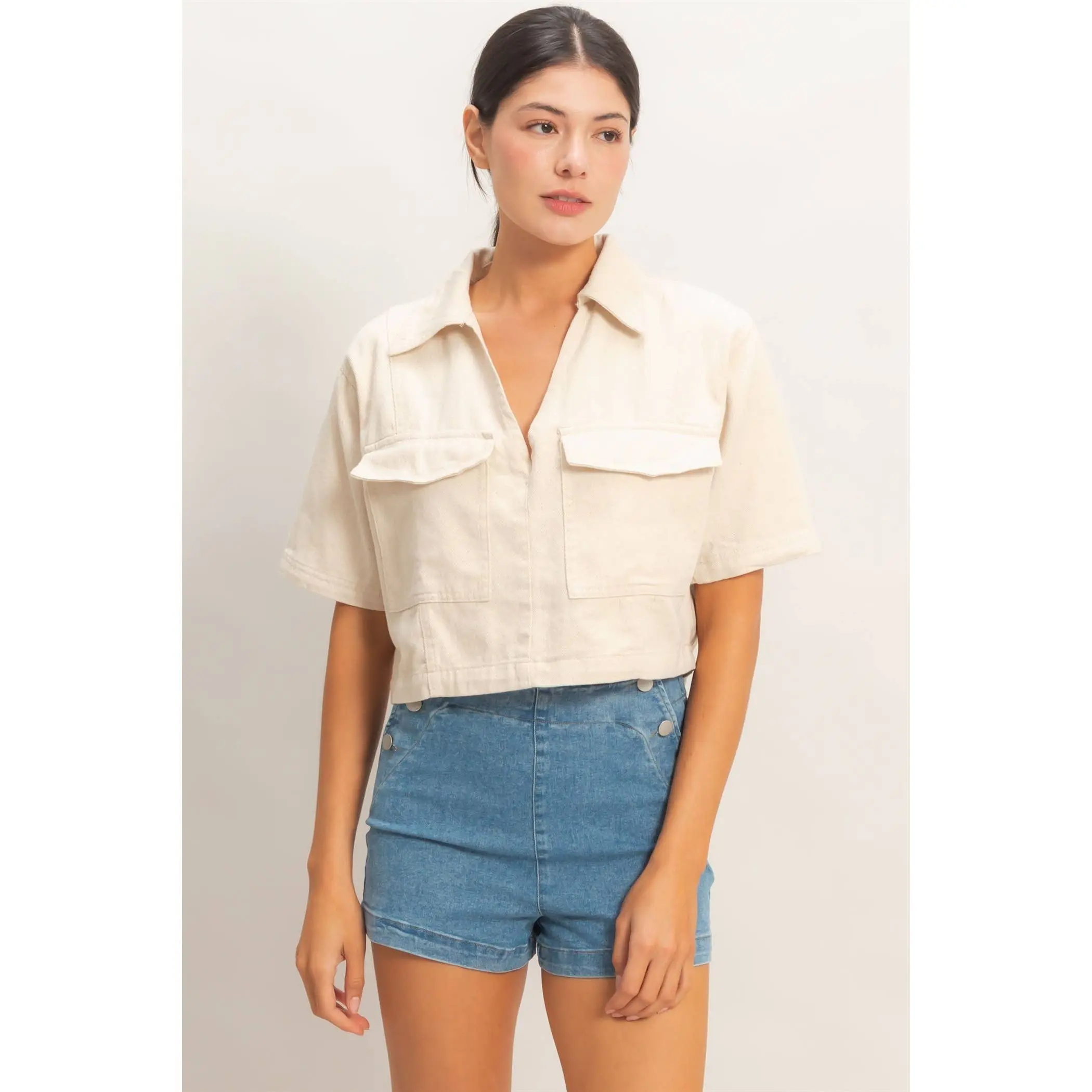 This top features a structured collar and a deep V-neckline, complemented by two front flap pockets for added style. The relaxed short sleeves and cropped length create a modern silhouette. Pair it with high-waisted jeans and sneakers for a chic, laid-back piece.
