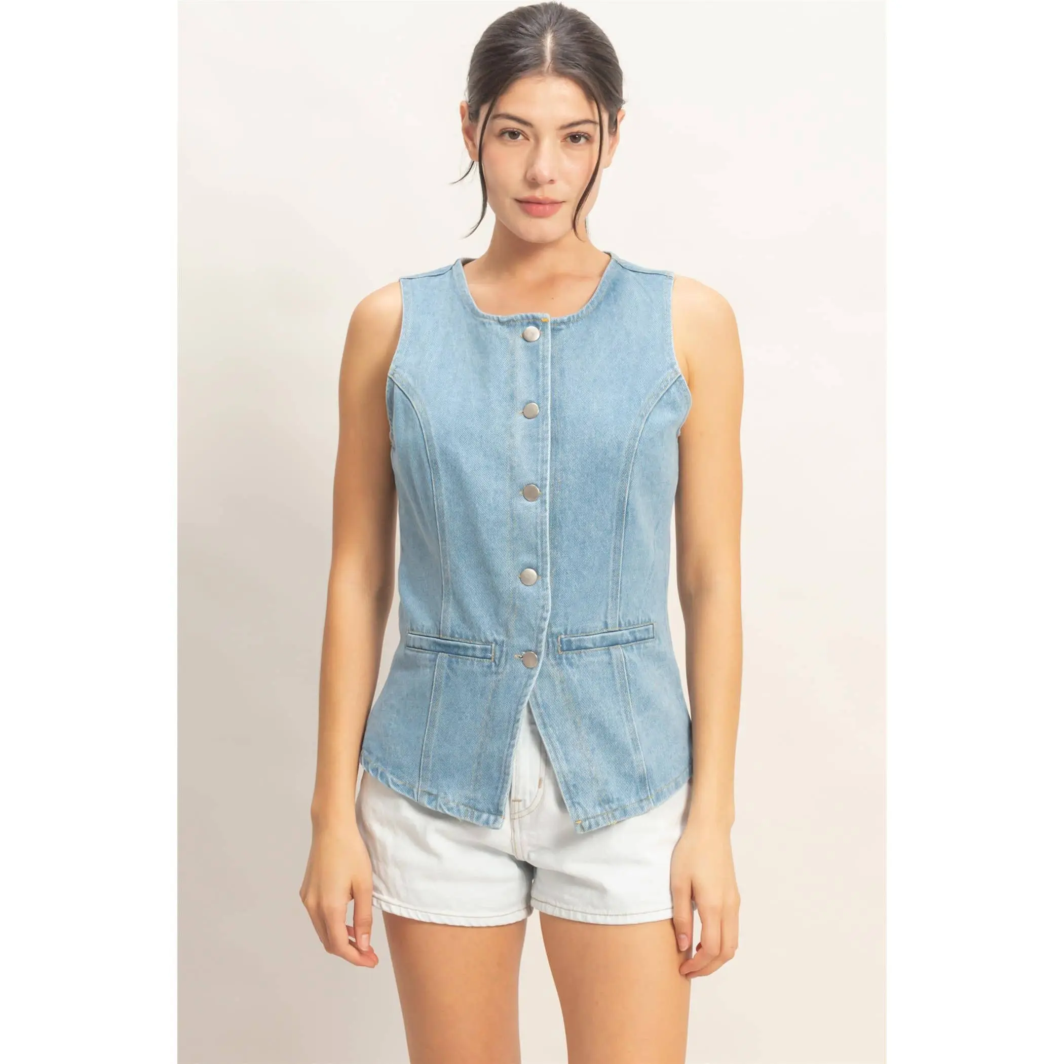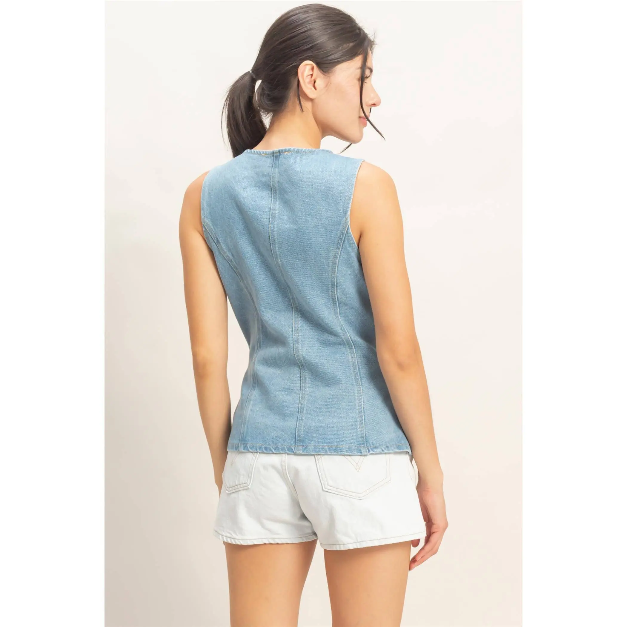 Sleeveless vest featuring a scoop neckline, structured seaming, and a full button-front closure. Crafted from enzyme-washed denim for a soft feel and natural fade that enhances its vintage-inspired character. Pair it with wide-leg trousers for a balanced, modern look, or layer over a fitted long-sleeve top for an elevated daytime ensemble. Denim 75% Cotton 25% Polyester, White Denim 100% Cotton Model Is 5' 8" Tall, 32" Chest, 25" Waist, 35" Hips And Wearing A Size Small Imported. Designed In The USA