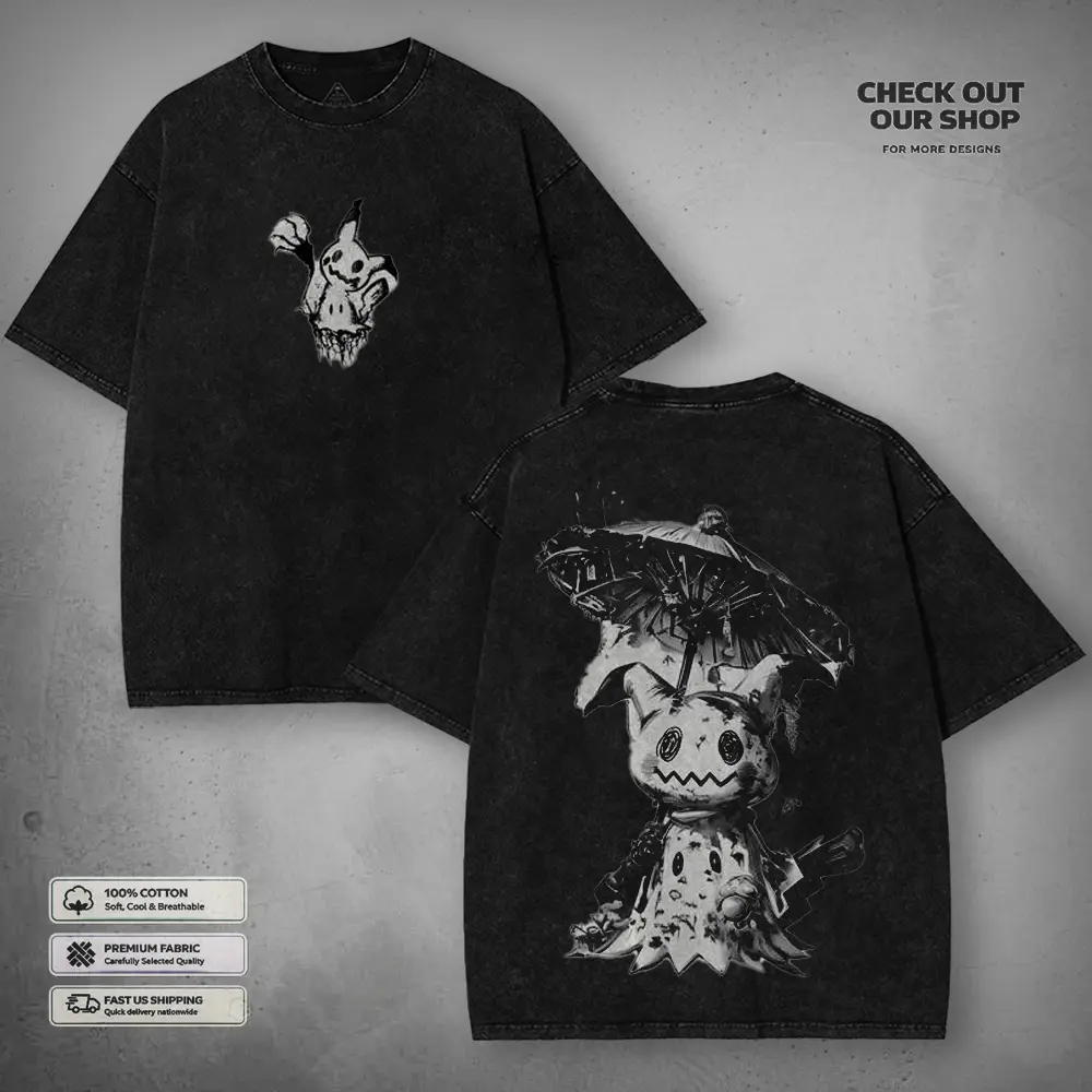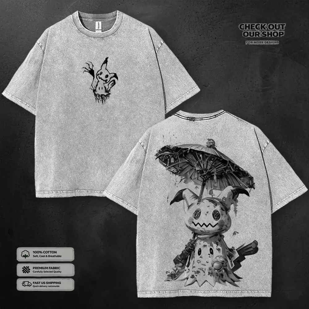Mimikyu - PKM Grunge Aesthetic Washed T-shirt, 90s Vintage Anime Streetwear Tee, Unisex Heavyweight Cotton T-shirt for Anime Fans