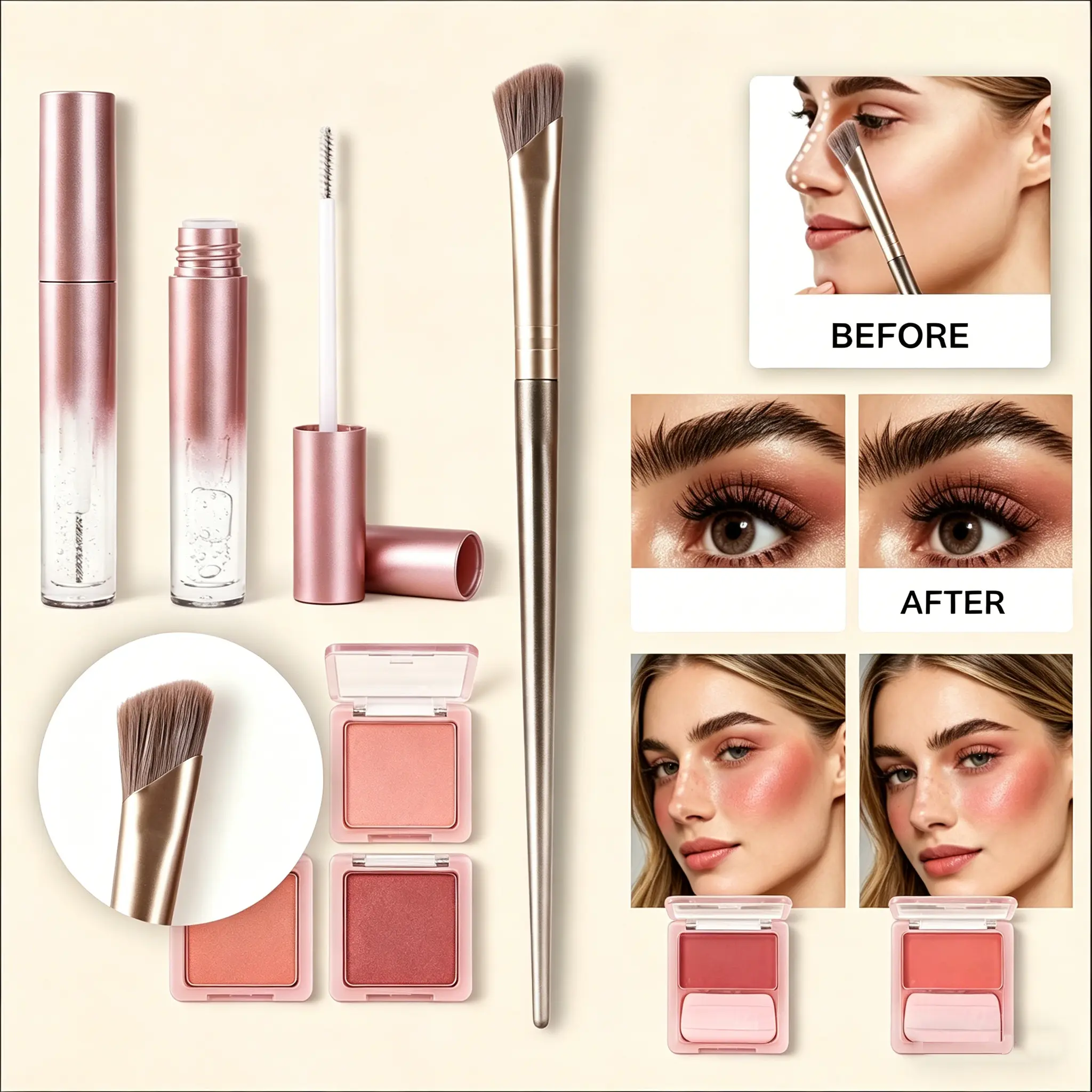 This set includes three essential beauty tools for a quick 5-minute makeup routine. Perfect for everyday use, it features a blush brush, a blush palette, and a mascara. The blush palette offers two shades for versatile application. The blush brush is ideal for precise application. The mascara is in a sleek, rose gold tube.