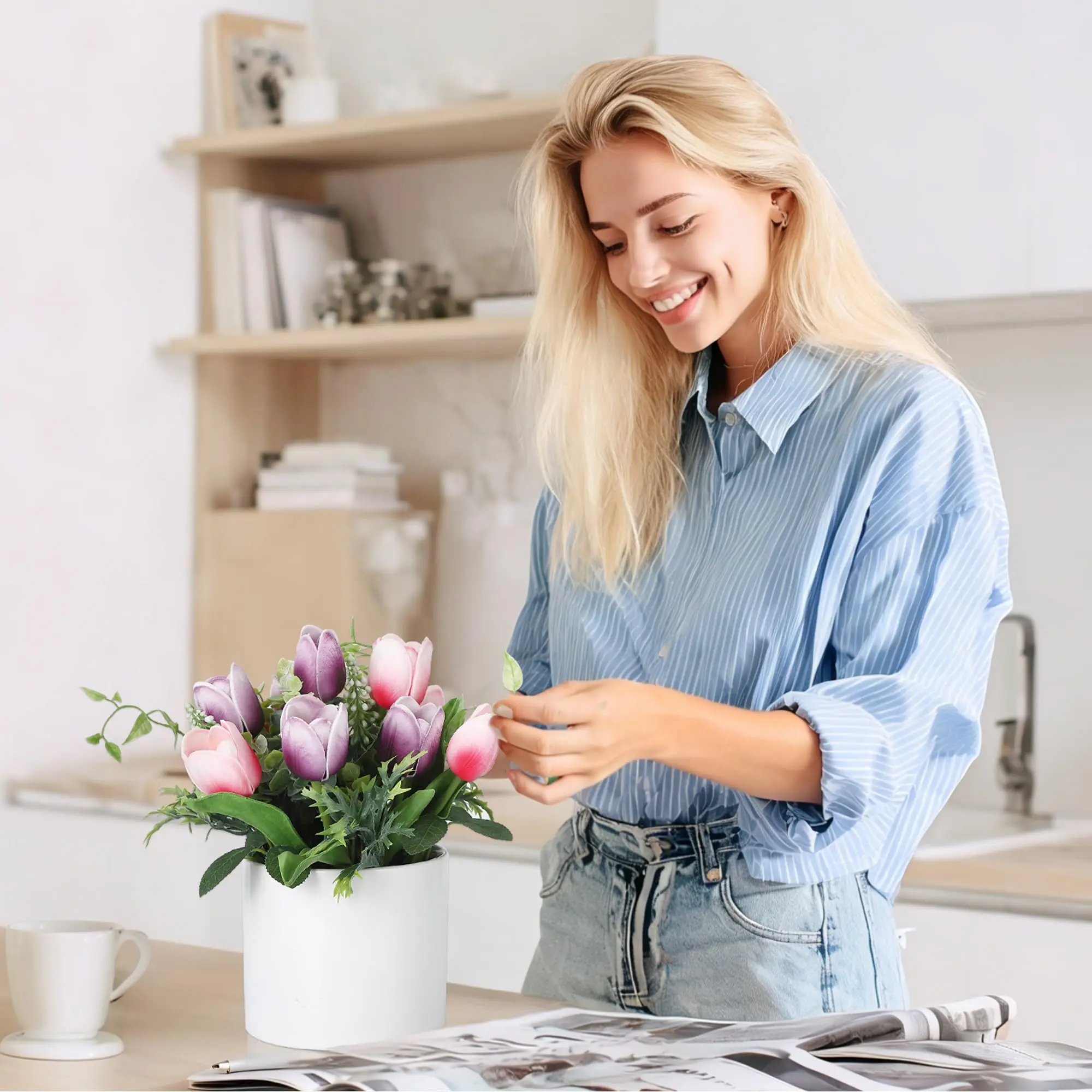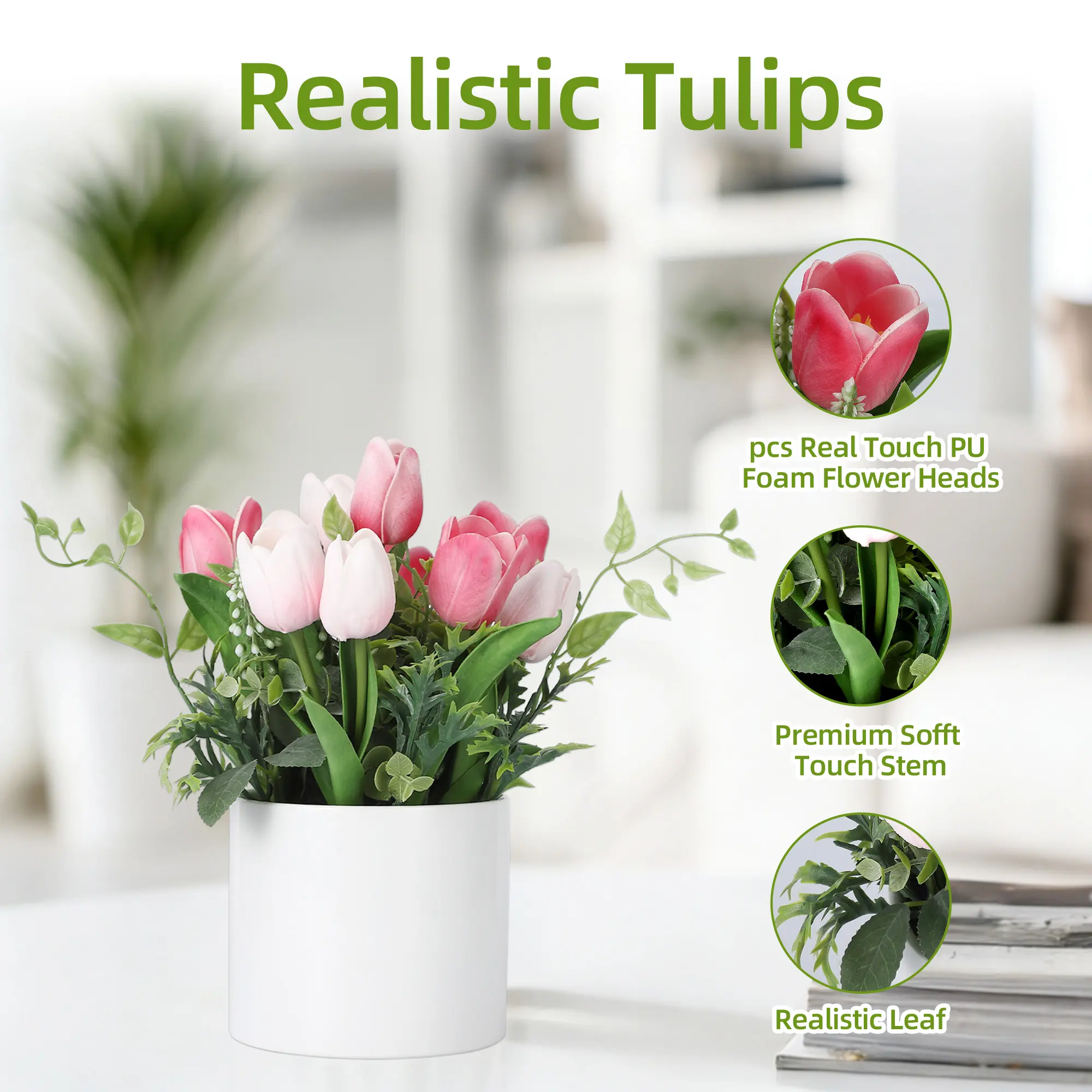 Elevate your home decor with our exquisite set of realistic flowers. These fake tulips are meticulously crafted from premium PU material to replicate the delicate look and feel of real blooms. Each artificial tulip stem is designed at a perfect 6.9" height, making them ideal for the included ceramic pot, vases, or any decorative container.