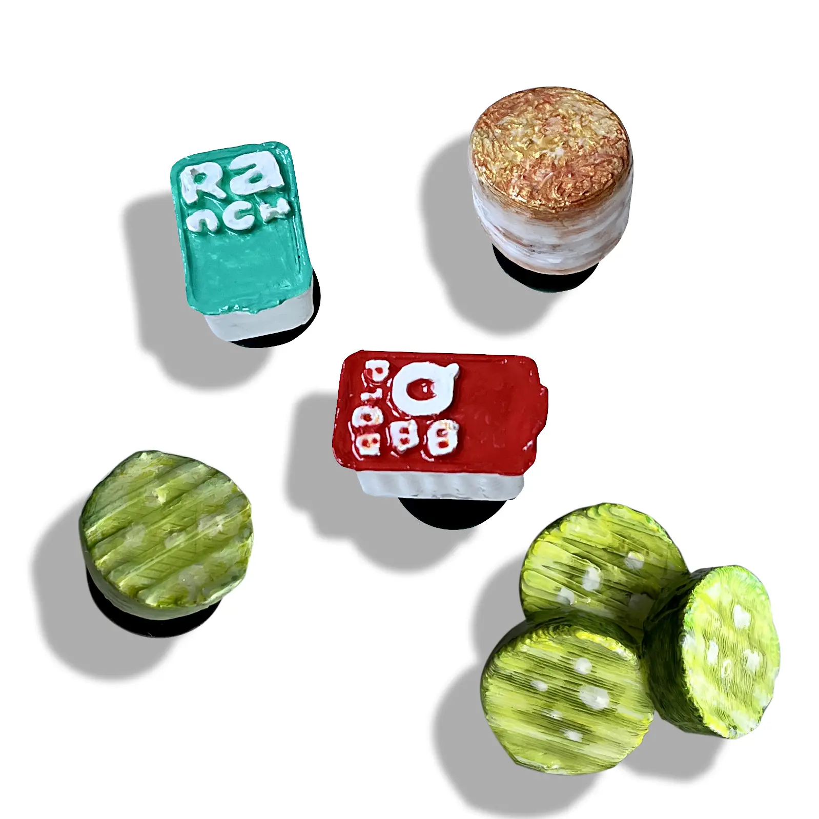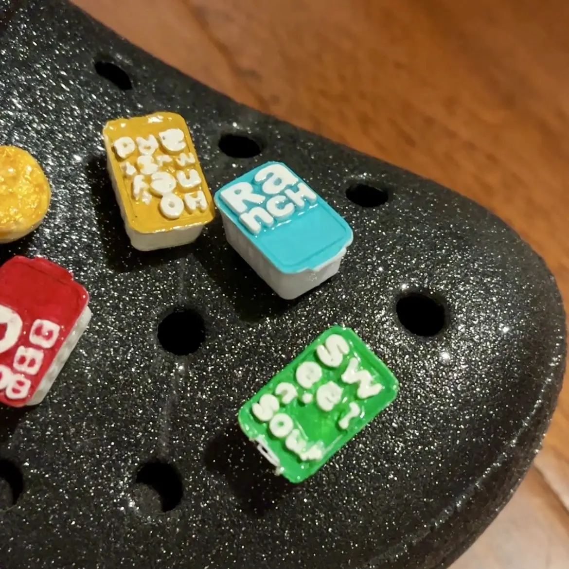3D printed charm for Crocs shoes! A unique gift for fried chicken lovers. A crunchy biscuit, dipping sauce for chicken nuggets, or sandwiches with glossy finishing on a button. Each piece is made with numerous process including 3d printing, polishing, painting, enameling and packing which takes hours to complete one piece of charm, it's truly piece of art. All of the charms come with a mini box, and a proof with signature from artist, collect them all now.