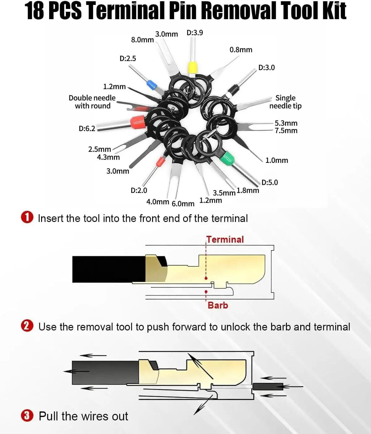 ·Includes hose clamp plier, electrical terminal removal tools, and 18 pin removal accessories