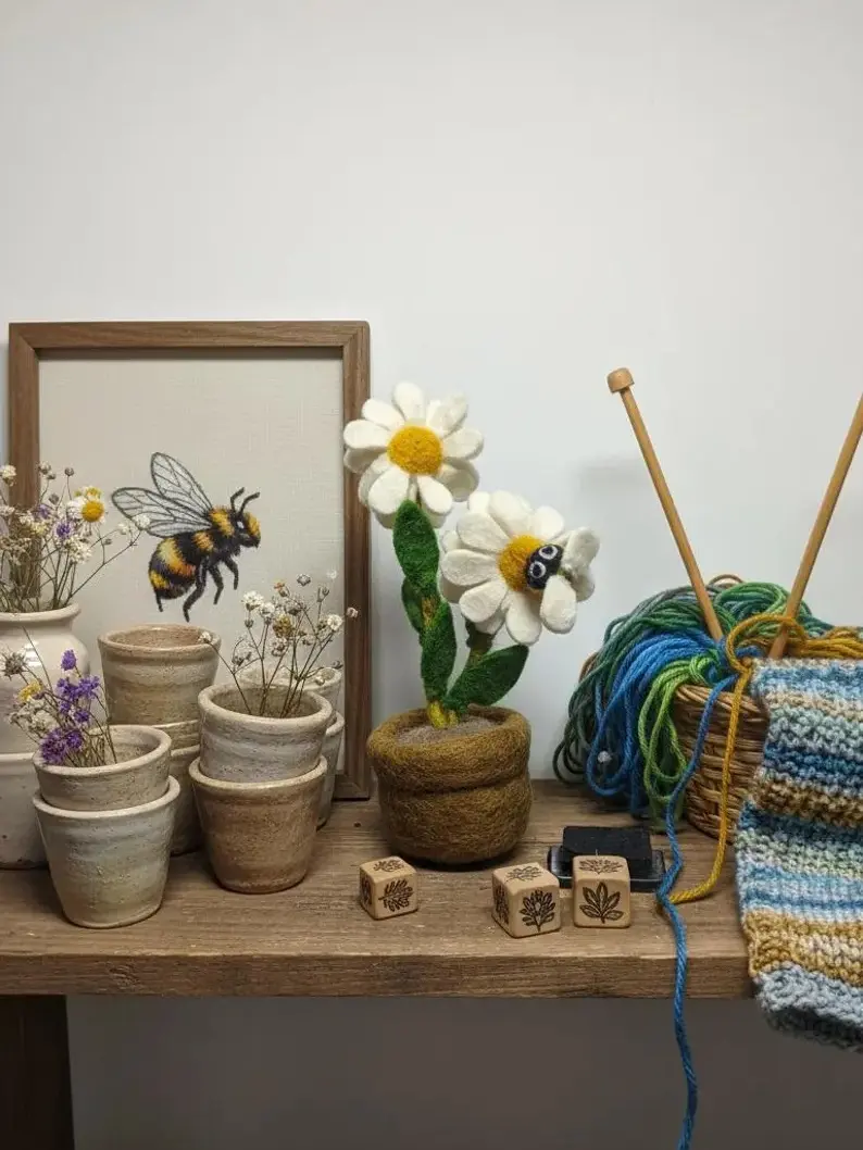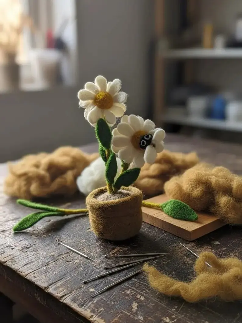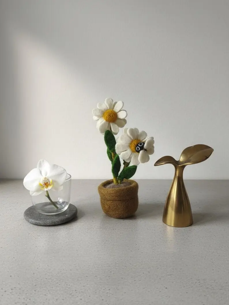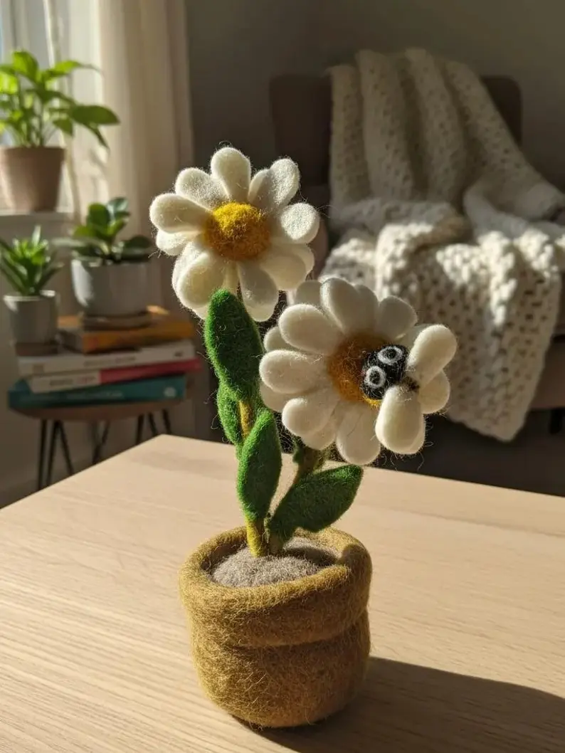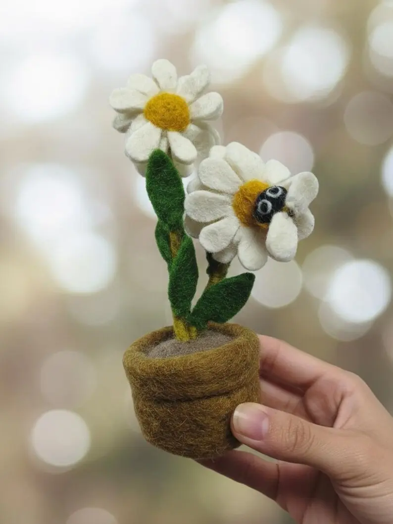 Brighten your space with this charming needle-felted daisy! Handcrafted from pure wool, it features two white daisies with yellow centers and green leaves. A tiny bee perches playfully on a petal. Set in a soft brown wool pot, it requires no watering or sunlight. Perfect for desks, bookshelves, or windowsills, it brings a slice of spring indoors. Treat yourself or surprise a nature lover with this eco-friendly handmade treasure!