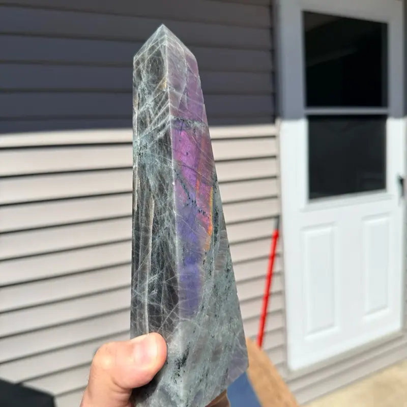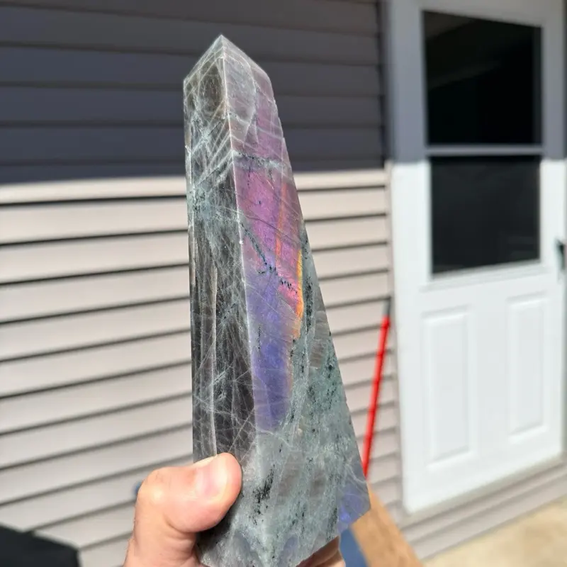 This stunning labradorite obelisk features strong multi-color flash with vibrant purple, blue, and gold tones that shift beautifully in the light. A true statement piece with eye-catching energy and presence.