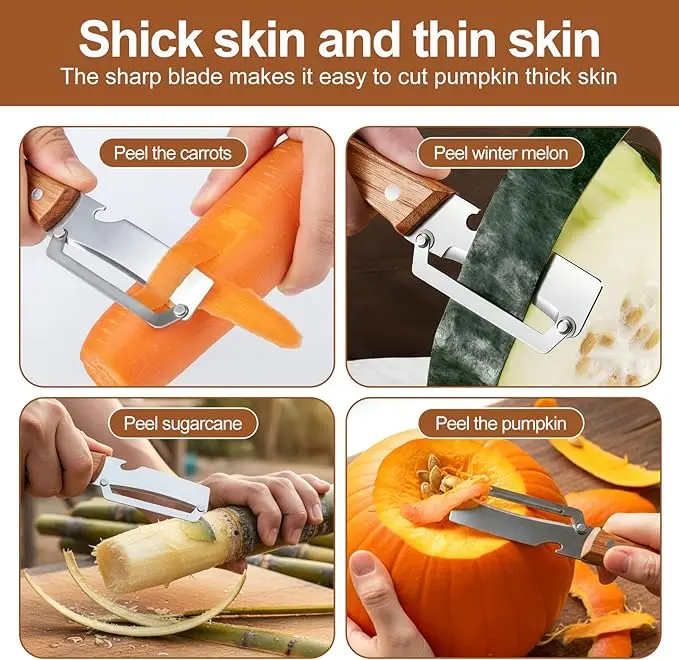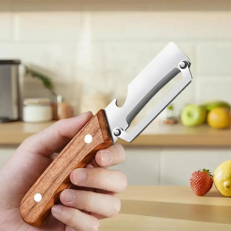 This peeler is a must-have for your kitchen. The wooden handle and stainless steel blade make it a reliable tool. The bottle opener is a handy addition. Use it for peeling apples, potatoes, pumpkins, papayas, and zucchinis.