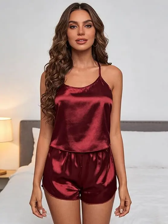 Designed with a smooth, silky feel, this 2-piece set includes a cami top + matching shorts for the perfect blend of comfort, elegance, and femininity.