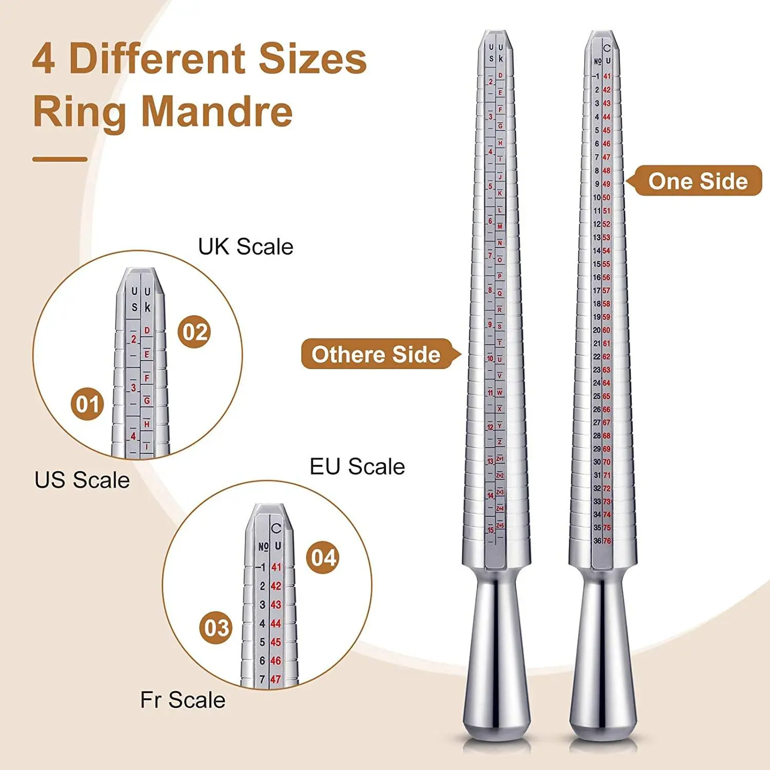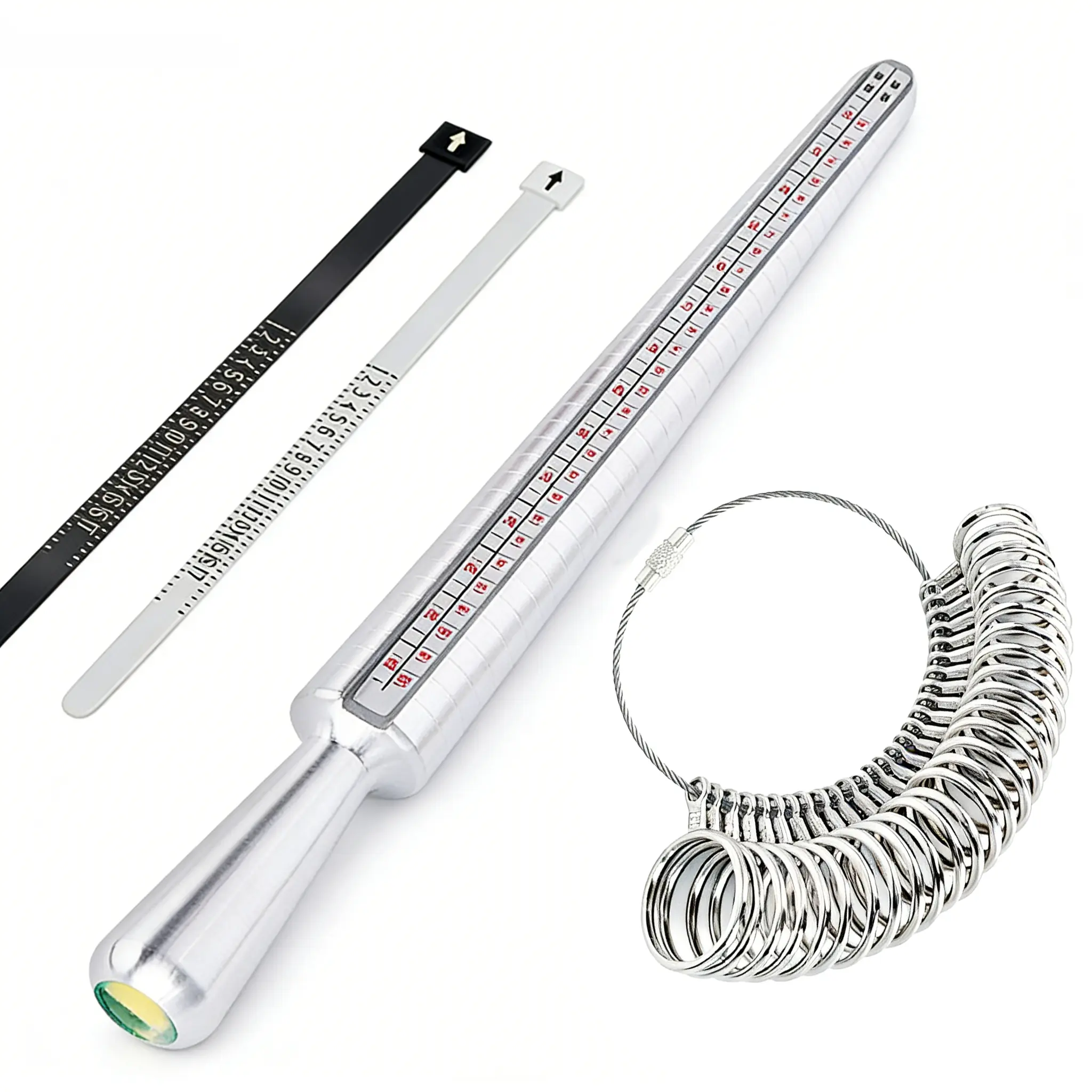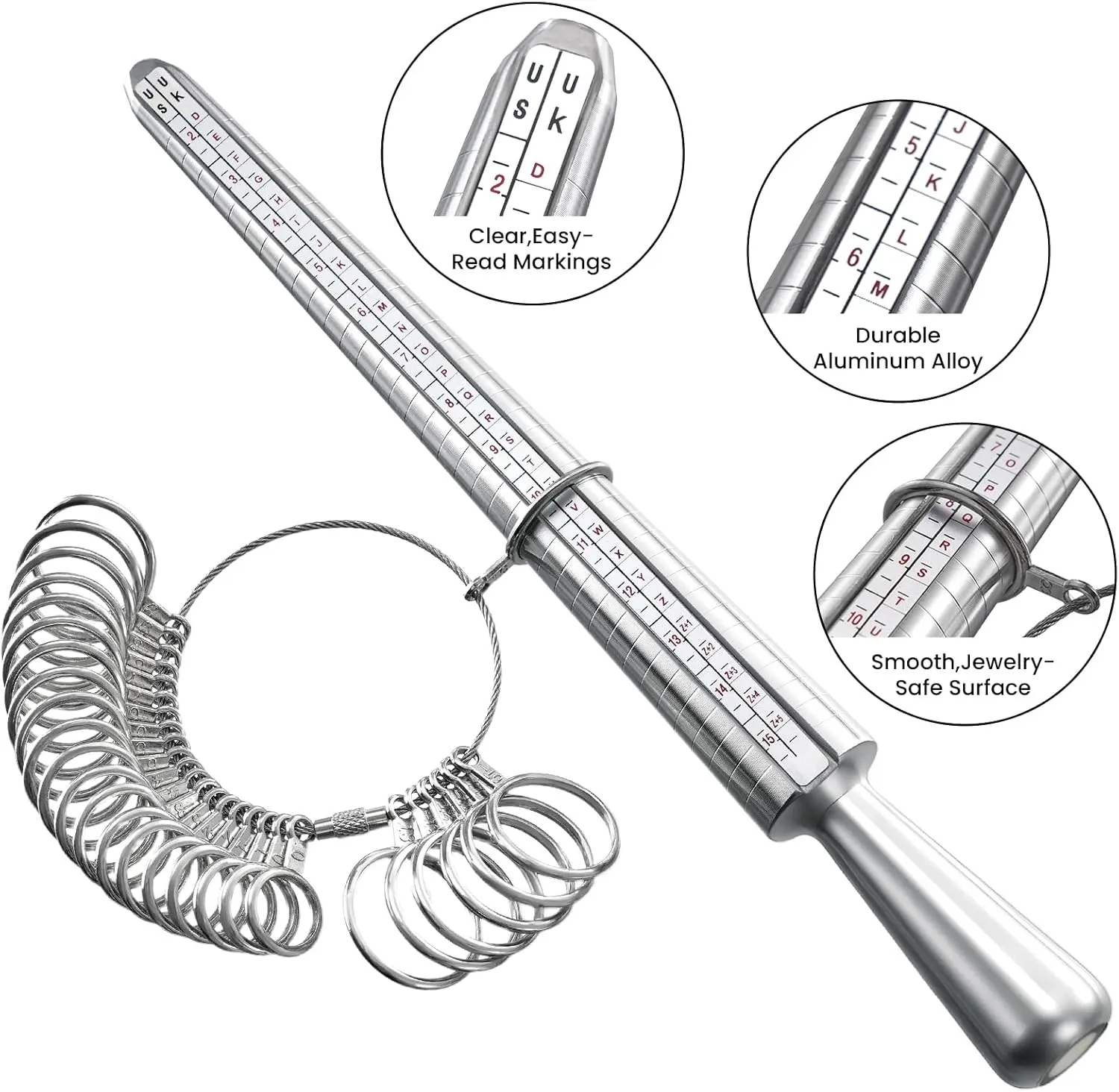 This alloy ring sizer set is your go-to tool for accurate ring sizing and resizing. Made from durable alloy, it ensures long-lasting precision. Ideal for professionals and hobbyists, it guarantees perfect fits every time. The set includes a US size ring mandrel, a ring gauge finger sizer, and two reusable finger sizer strips. All components are pre-marked with official US sizes, eliminating guesswork.