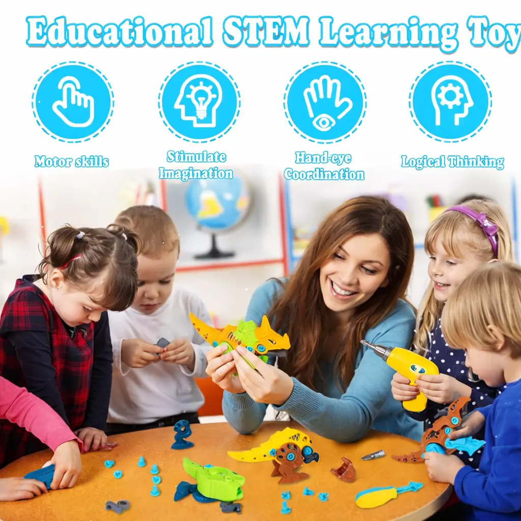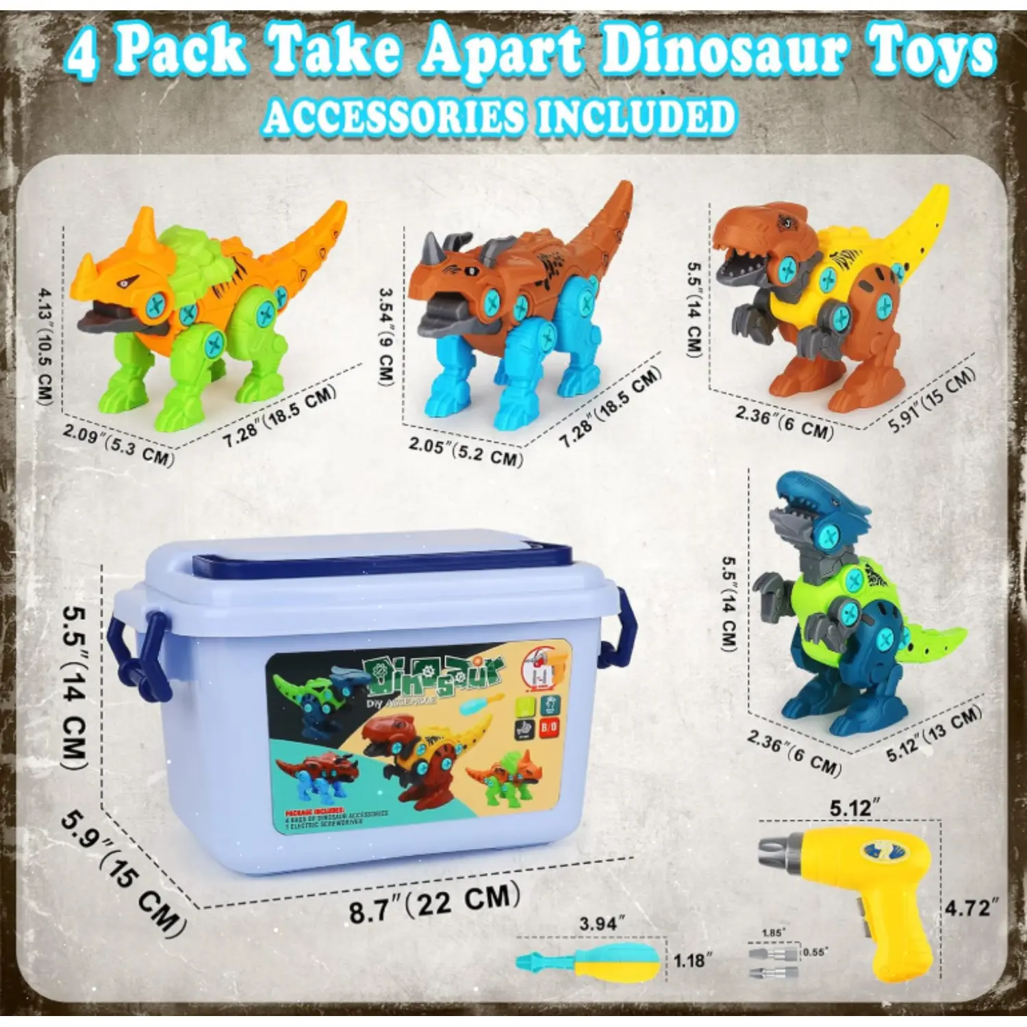 ·【4 Pack Take Apart Dinosaur Toys with Storage Box】 Our dinosaur building toy include 4 kinds dinos: Triceratops, Centrosaurus, Velociraptor, Tyrannosaurus, It also contains 1 electric drill, 1 hand drill and 2 screwdrivers, 1 storage box, Eletric drill work under 2 pieces of AA batteries, batteries not included in package. All accessories are easily stored in the Storage Box.