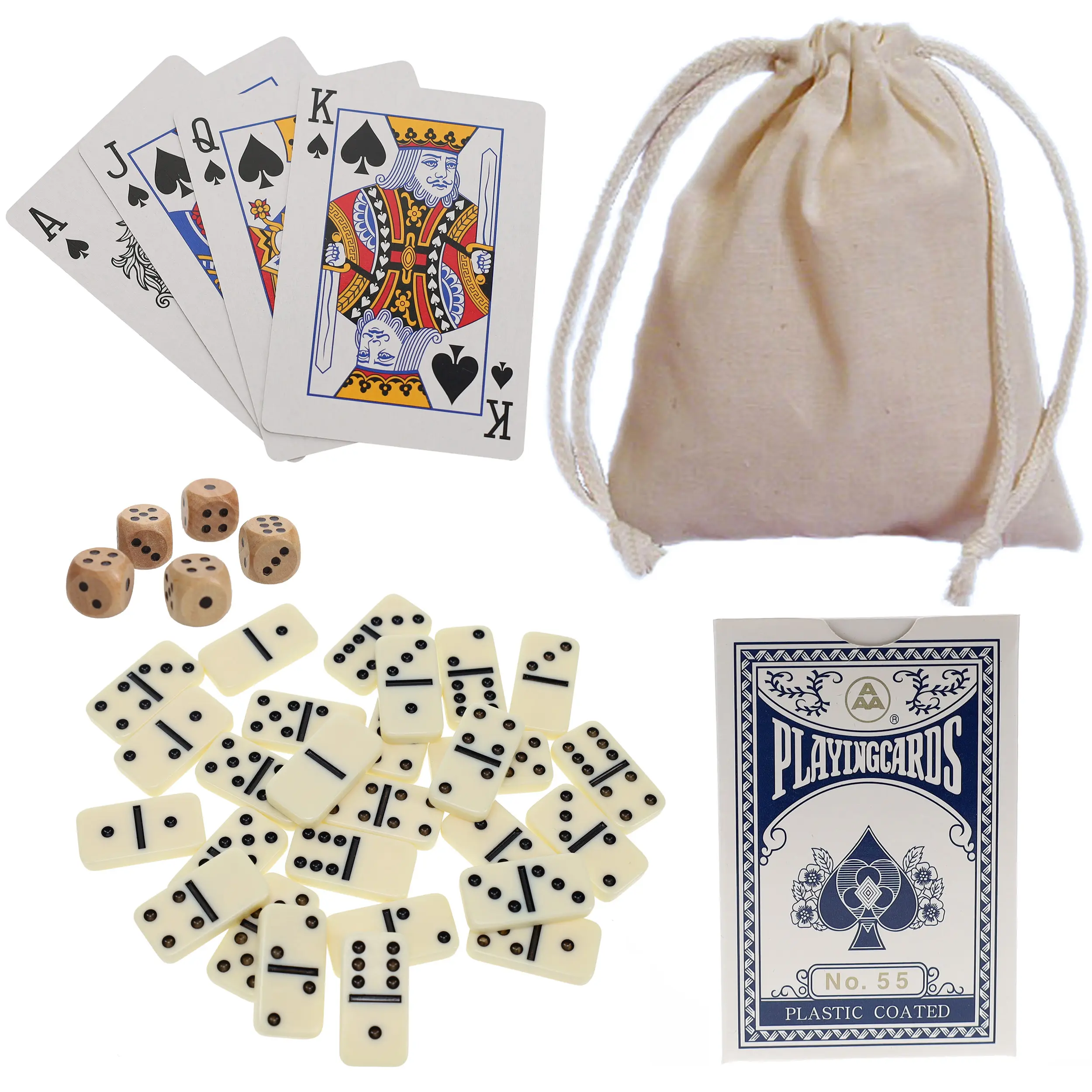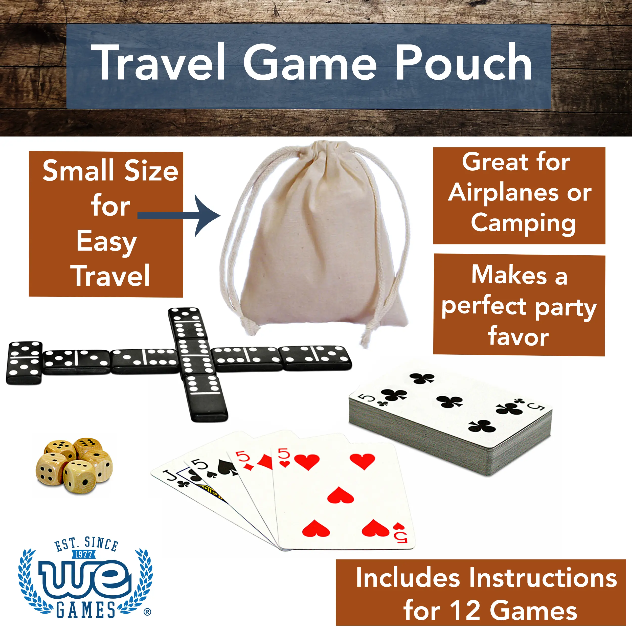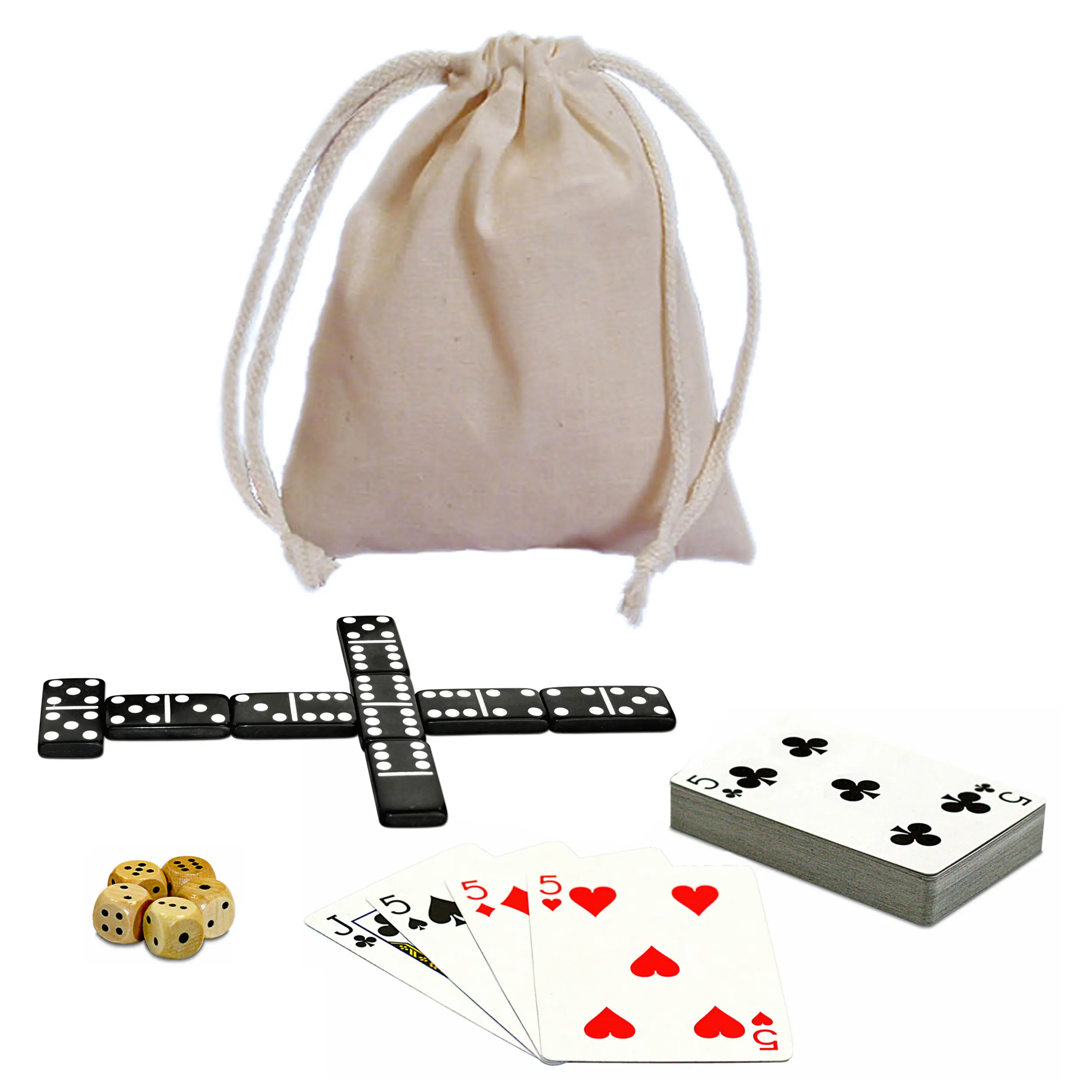 From double six dominoes to solitaire, this small game set is a must-have while traveling or camping. With over a dozen games that can be played from this small travel set, the hours will pass fast while having fun. Comes with five wooden dice and a poker card set that is plastic coated for high durability. The entire set can be stored in the included cloth bag for convenient travel.