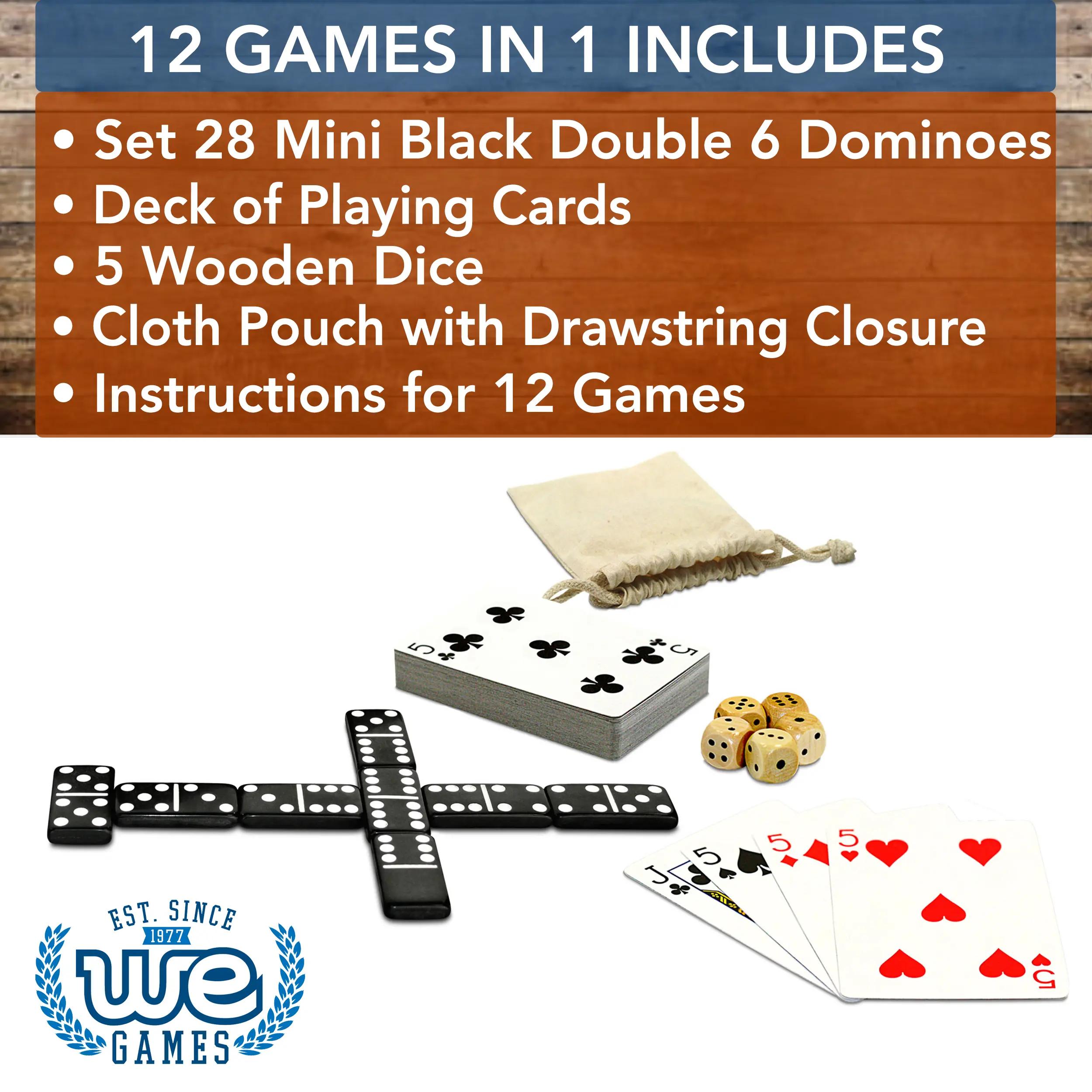 WE Games Mini Double 6 Dominoes, Dice and Card Travel Game