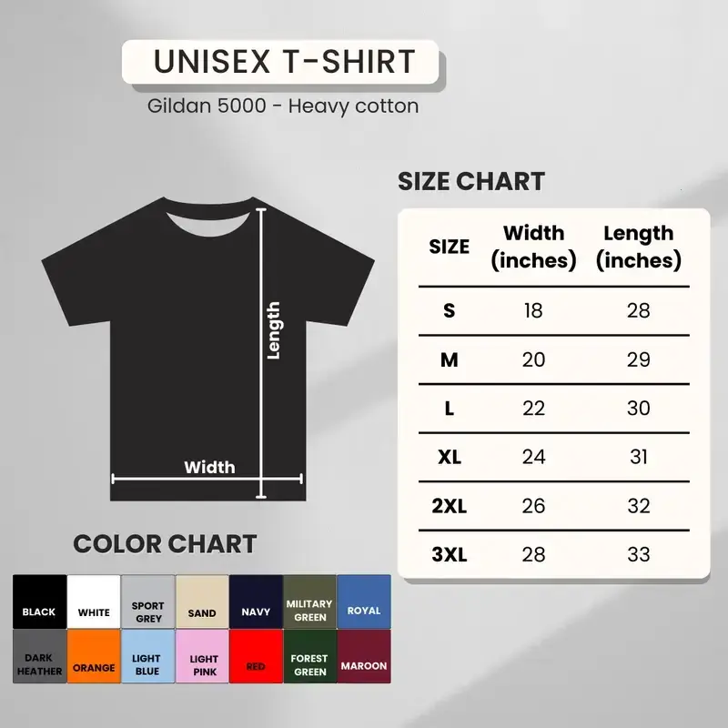 Unisex Design: All our shirts feature a classic, unisex design. Refer to the size chart in the listing photo for precise measurements. For an easy fit guide, take your favorite shirt, lay it flat, and measure the width (armpit to armpit) and length (top to bottom).