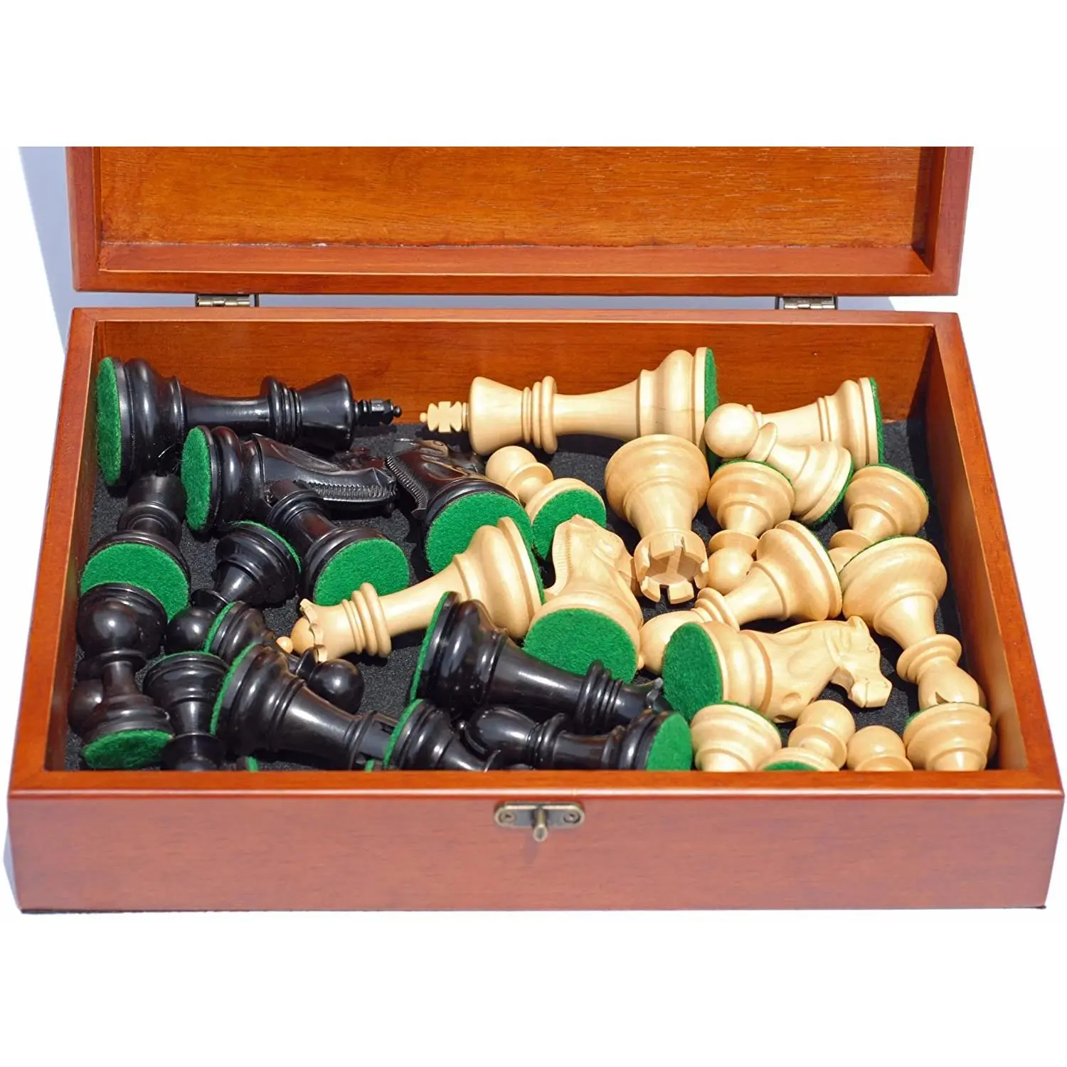 These wooden Jacques Chessmen are the perfect choice with their classic style and beautiful craftsmanship They are weighted and hanpolished and are crafted of black stained Kari wood). This fine set of chess pieces is graciously stored in our beautiful wooden treasurure box. The handsome box continues the fine tradition of boxes throughout history, combining function with decorative purpose, and will be cherished for its fine craftsmanship for generations.