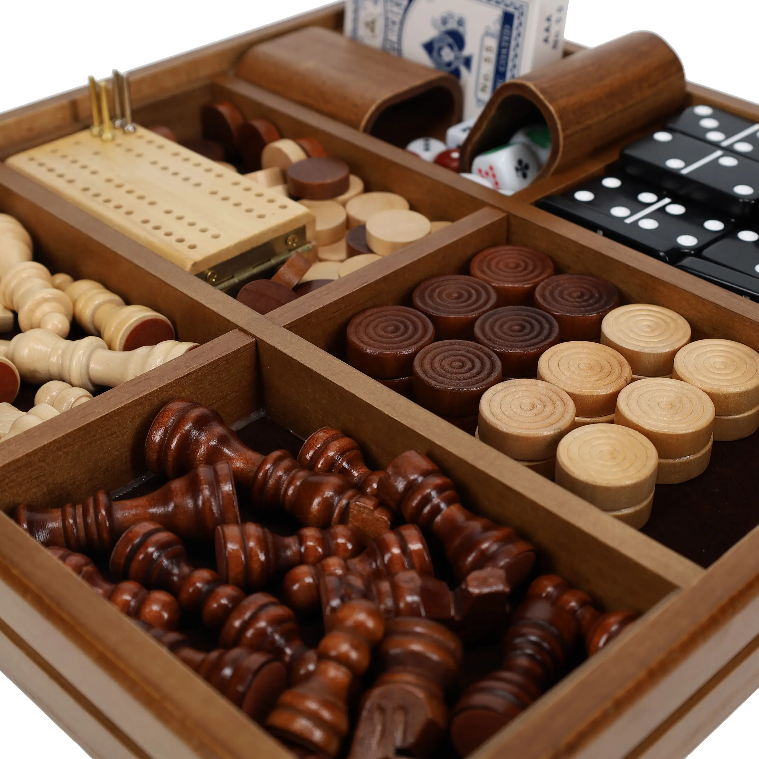 We love this wooden combination game set as a gift because it is handsomely crafted yet incredibly comprehensive because it features all of the most popular and cherished games inside one set. It includes Chess, Checkers, Backgammon, Dominoes, Cribbage, Poker, Dice and Cards. This is a game set that should be in every home! The Walnut veneer chess and checker board has a raised border and a backgammon board on the reverse side.