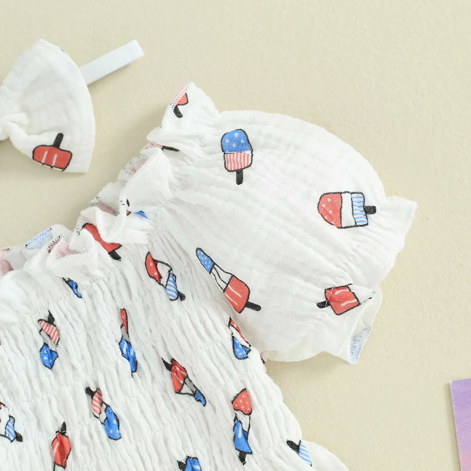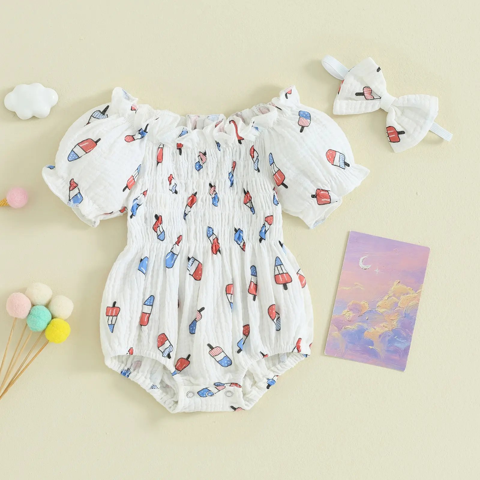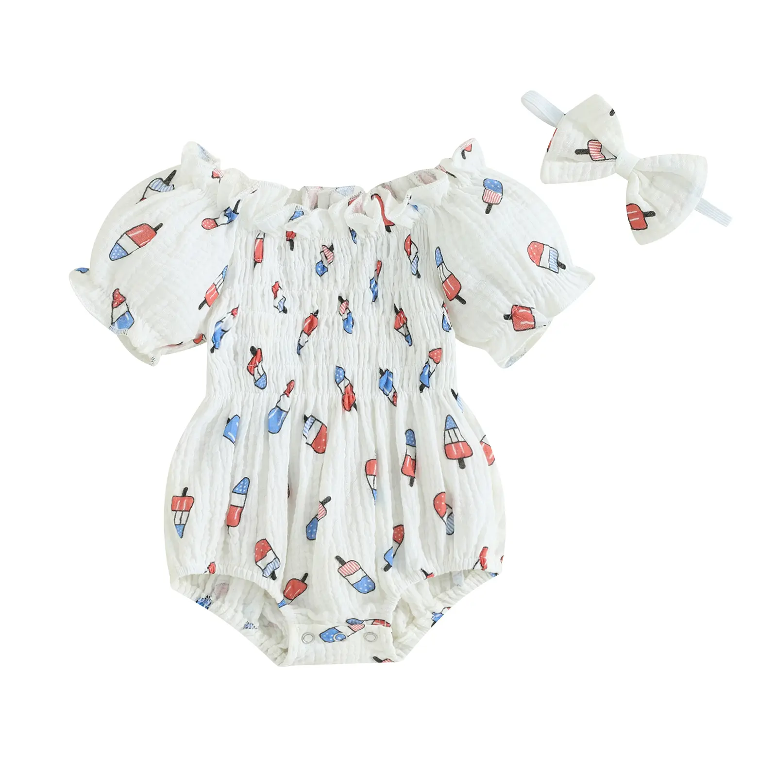 Newborn Girl Outfit, Short Sleeve Pleated Popsicle Print Bodysuit with Bowknot Headband 4th of July Clothing