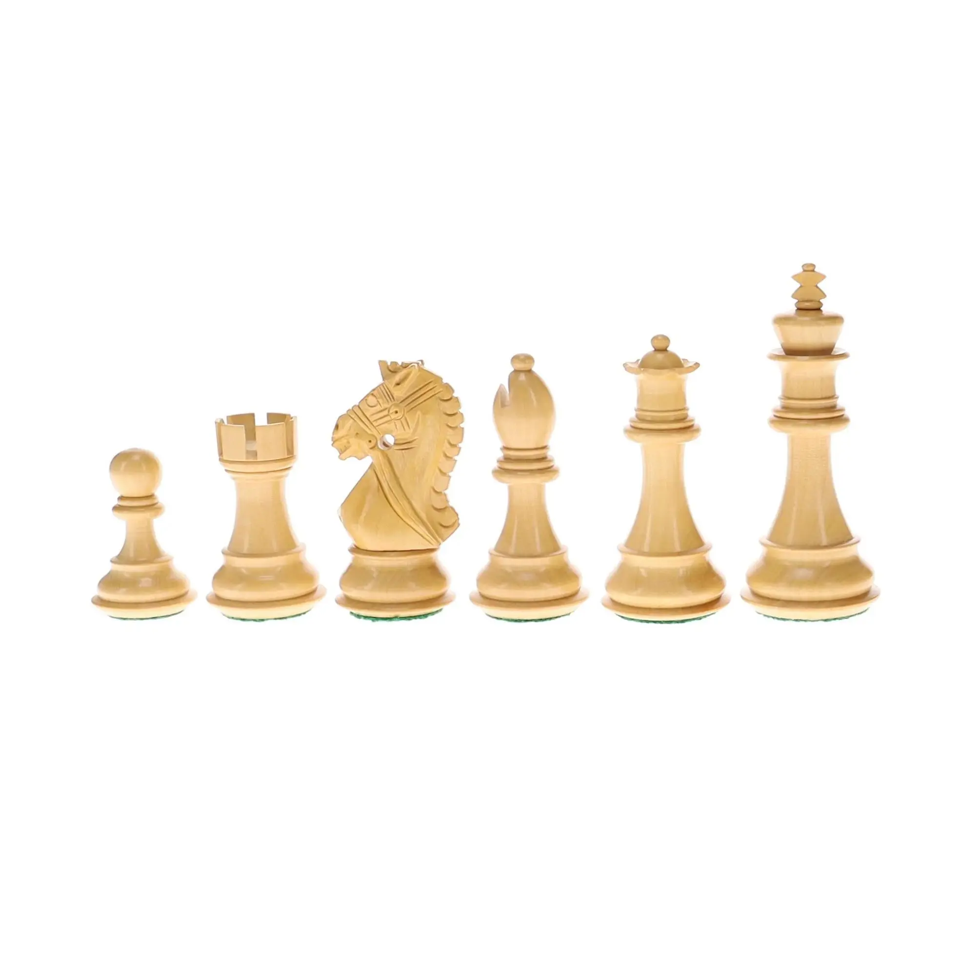 These pieces fit perfectly on chess boards with 2.25 inch squares. King measures 4 inches tall with a 1.64 inch diameter base.