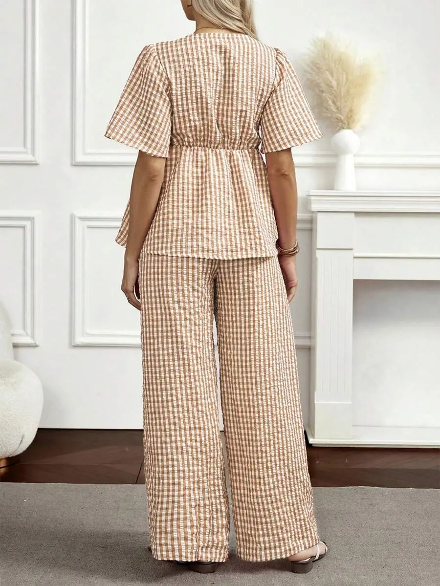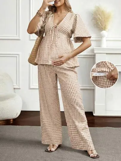 ZENIE Trendy Plaid Lace Up Blouse and Wide Leg Pants 2 Piece Set Cute and Comfy Everyday Outfit Perfect for Bump