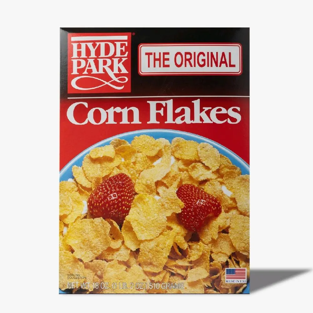 Hyde Park Original Corn Flakes is a traditional breakfast cereal made from toasted flakes of corn, known for its crunchy texture and simple ingredient profile.