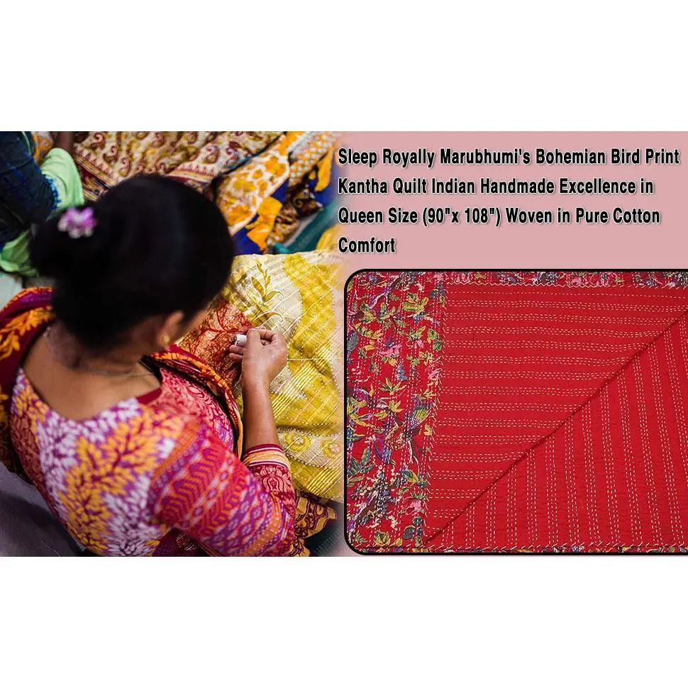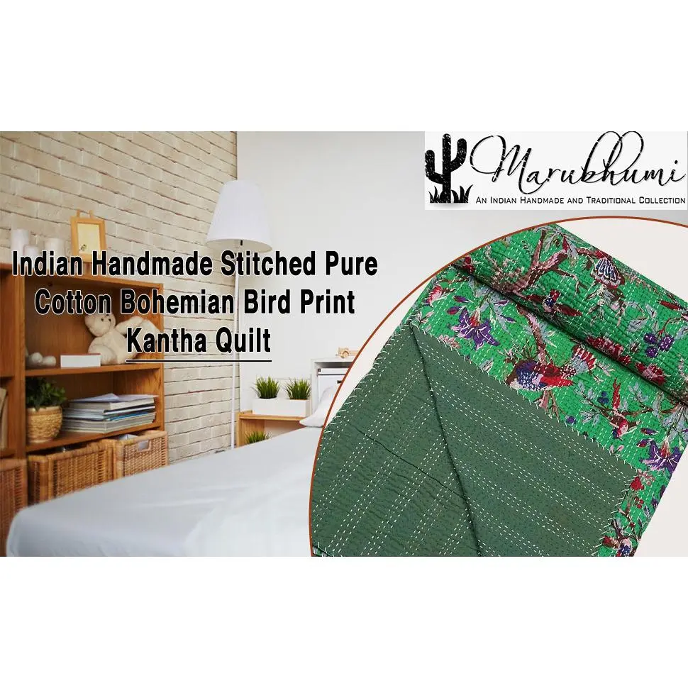 Tightly hand quilted - best used as a summer quilt or a throw!These are handmade product so color, design & pattern may be slightly different from picture shown for product and thread or stitching color may also vary from the picture shownKantha Quilt,Handmade Kantha Bedspread/Blanket Size-90*108 Inches/60*90 Inches which depends upon your size from variation.Washing Instruction : Dry Clean.DO NOT BLEACH {These are handmade product so color, design & pattern may be slightly different from picture shown for product.}Note: Their might be some negligible size variation of approx.2-3 inches due to handmade, hand washed, hand stitching & performing of Kantha work which is negligible