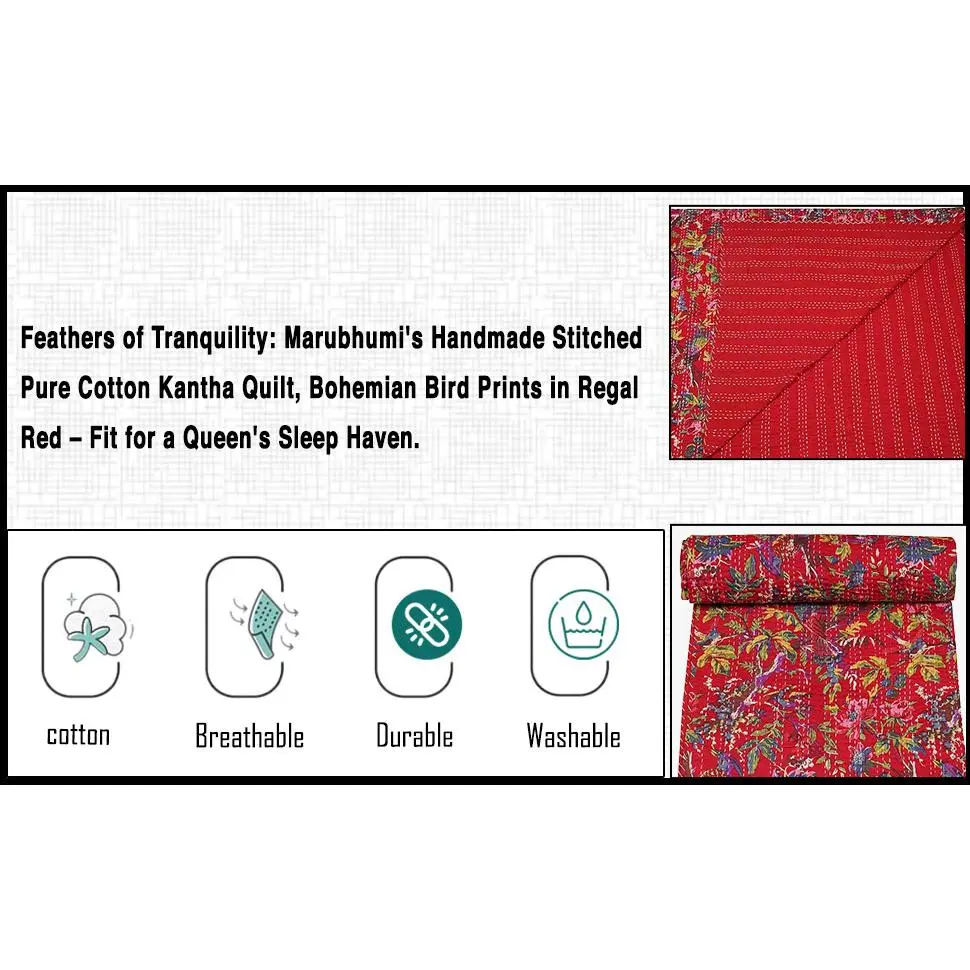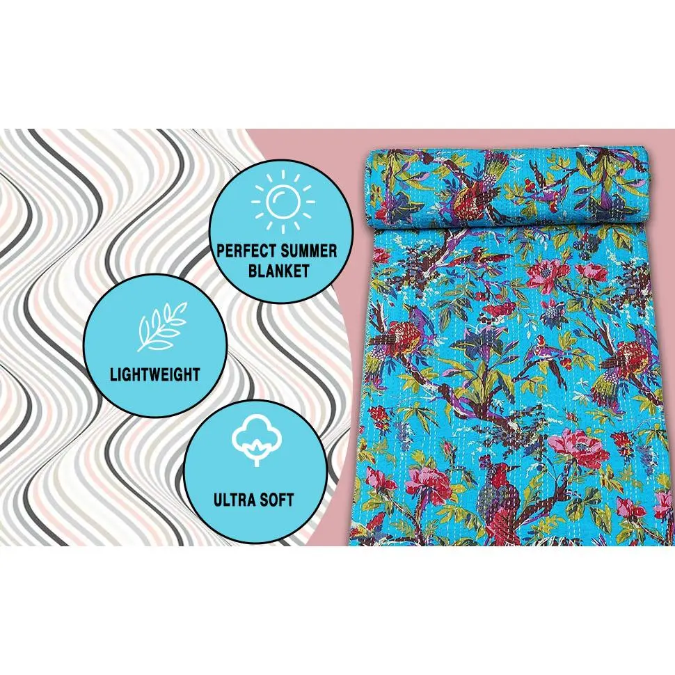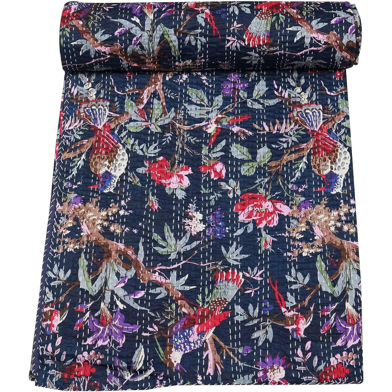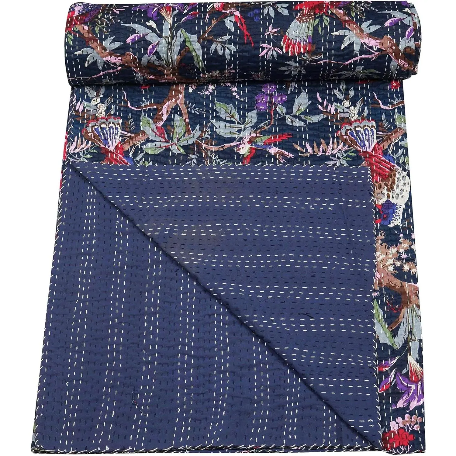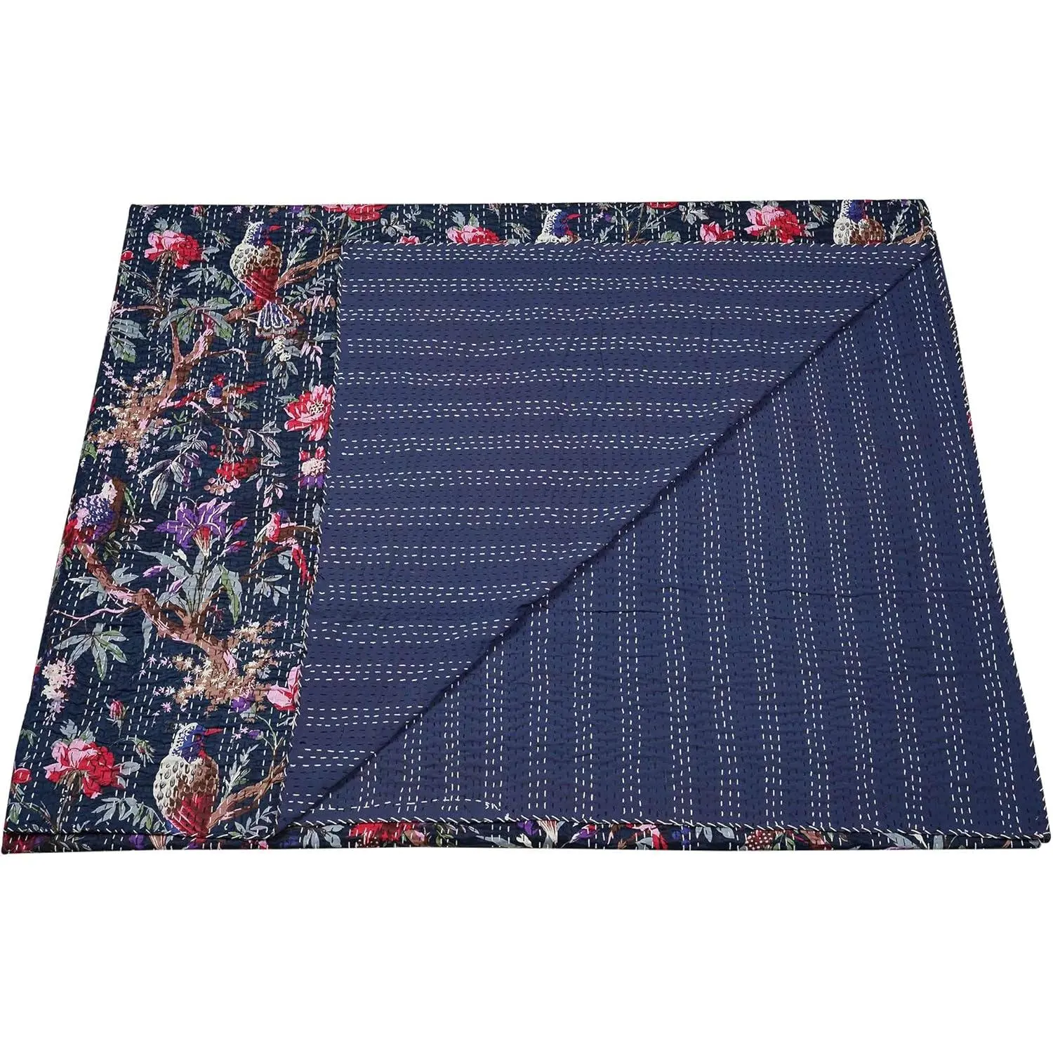 Indian Stitched Pure Cotton Bohemian Bird Print Kantha (Navy, Twin (60"x 90"))
