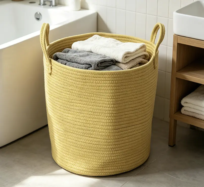 This large cotton rope woven storage basket is a perfect combination of practicality and minimalist style for every home. Made of soft yet durable woven cotton rope, it is lightweight, breathable, and friendly to daily use, ensuring long-term durability without deformation. Equipped with sturdy reinforced handles, it is easy to carry between the bedroom, bathroom, laundry room and living room.