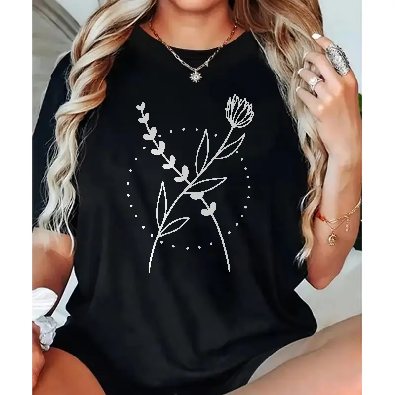 Minimalist Floral Line Art T-Shirt, Boho Botanical Graphic Tee for Women