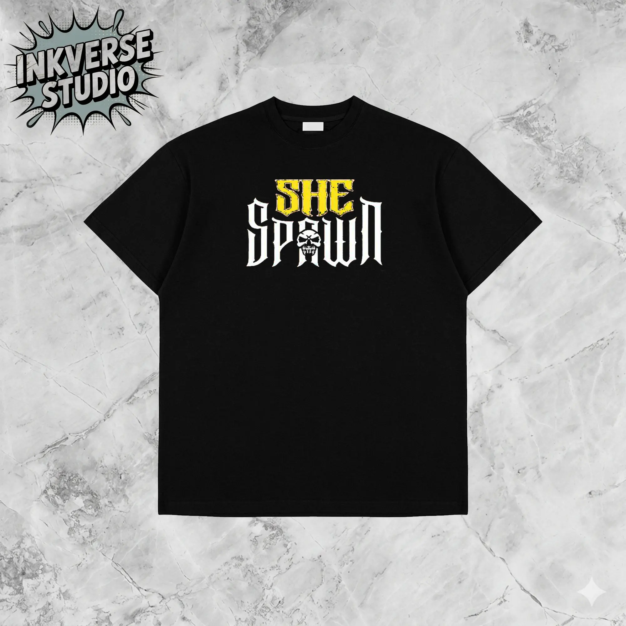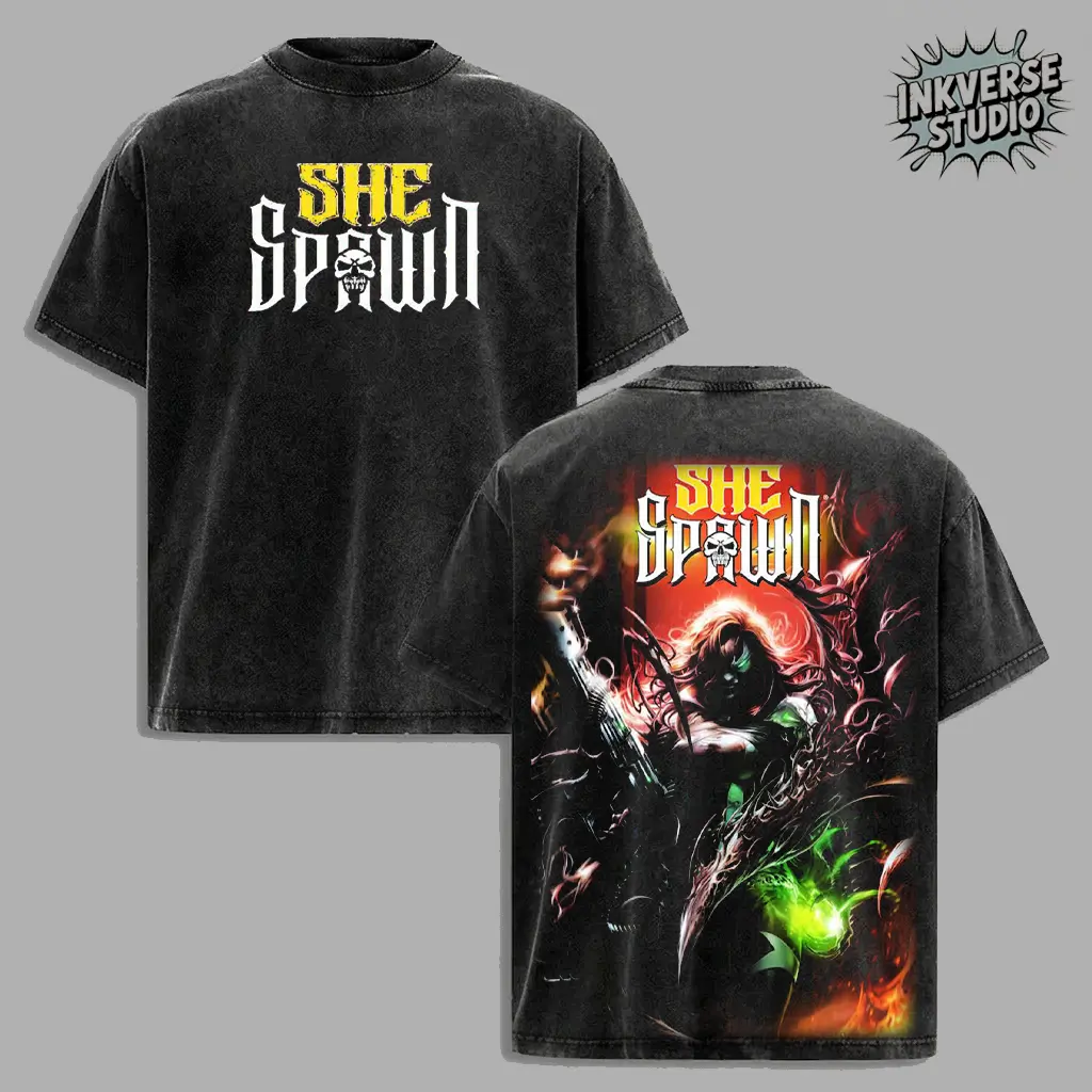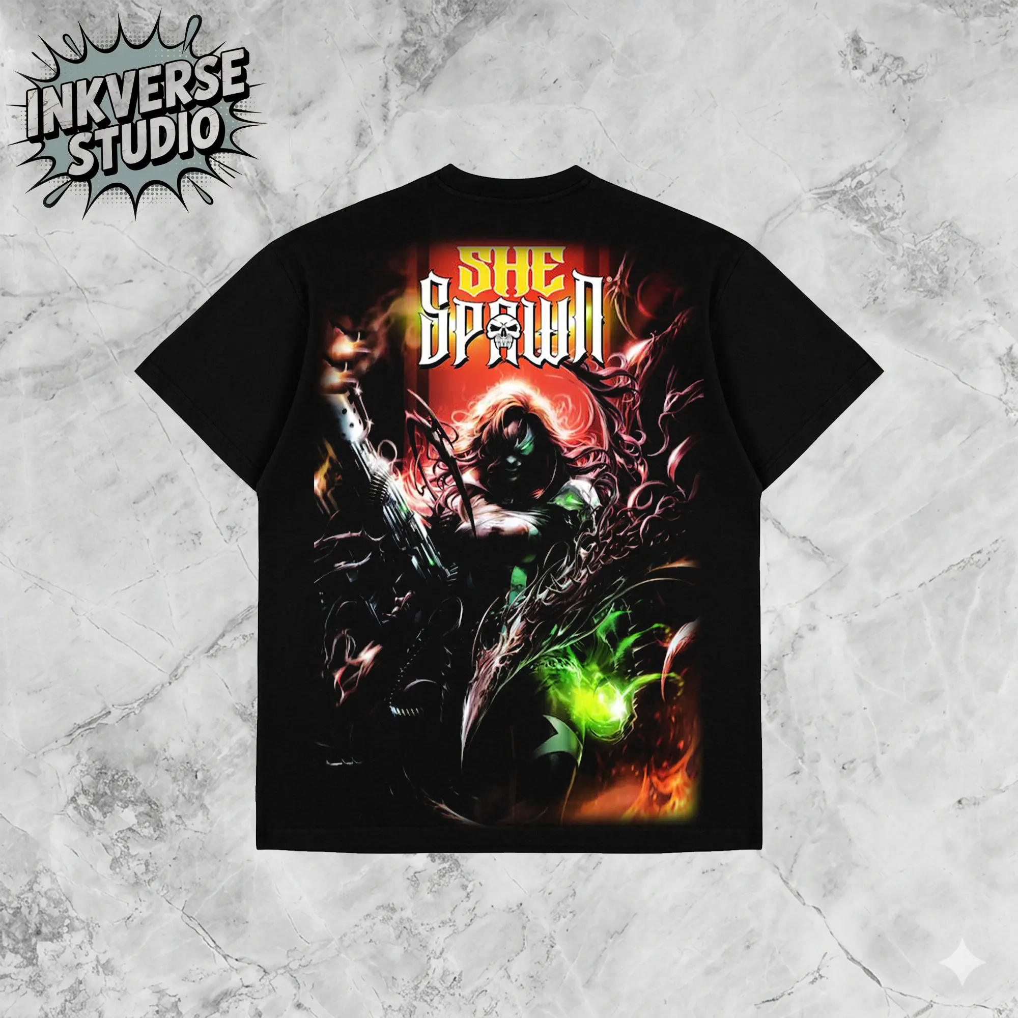 InkVerse Limited Edition She Spawn Comic Graphic Tee, Dark Fantasy Antiheroine T Shirt, Infernal Warrior Comic Art Design, Oversized Streetwear Unisex Tee, Gothic Horror Style, Gift for Dark Comic Fans