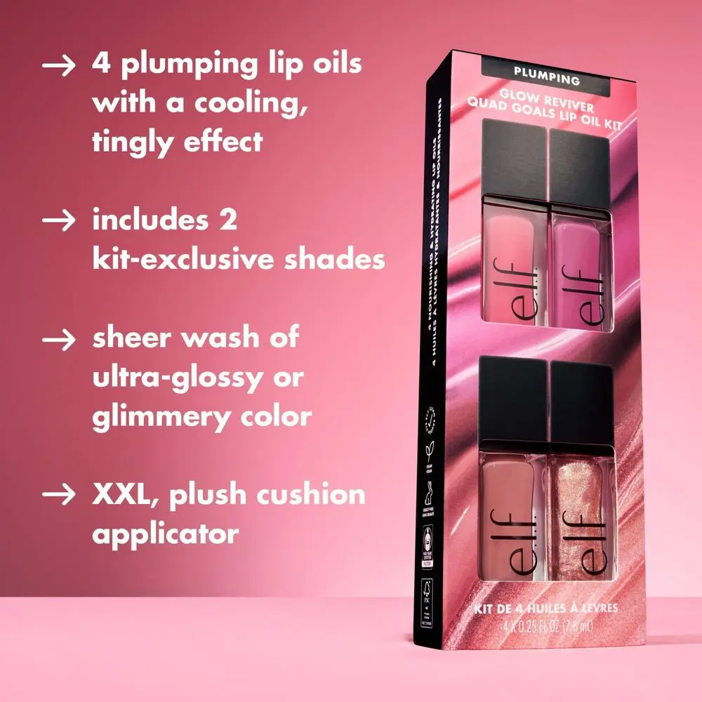 The gift on every e.l.f.ie’s lips. Get 4 e.l.f. Cosmetics Glow Reviver Plumping Lip Oils in one must-have lip kit, featuring 2 exclusive shades you won’t find anywhere else! These pout-plumping, tingling lip oils drench lips in a sheer wash of color, with both glossy and glimmer finishes for a juicy lip look. The comfortable, non-sticky formula is infused with nourishing oils and a fresh minty scent.