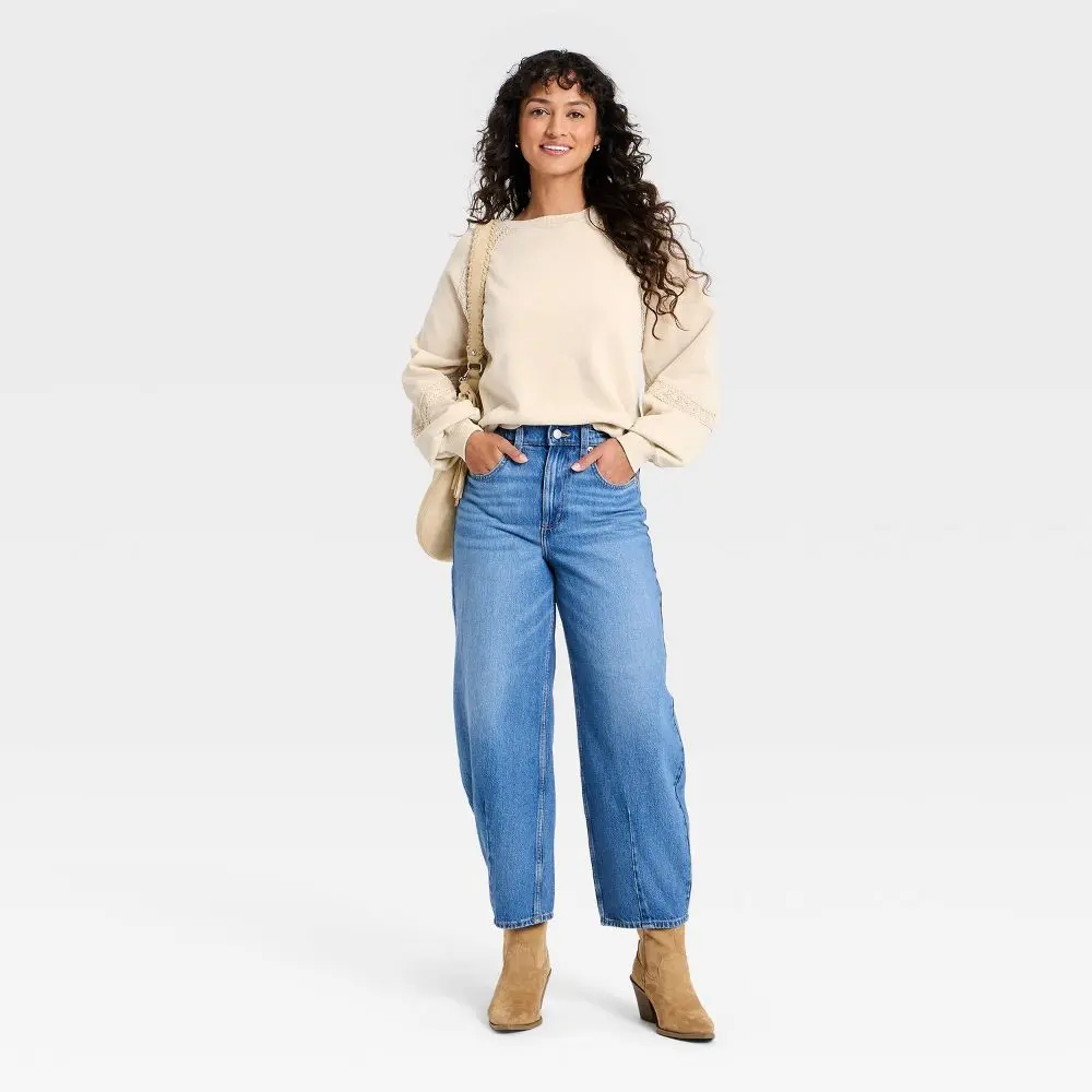 Elevate your casual look with the Crochet Trim Sweatshirt from Universal Thread. Designed in a lightweight French terry fabric with a crew neckline and raglan sleeves, you get the comfort of a sweatshirt while the knit-style trim details elevate your look. Made from a blend of cotton-recycled cotton fabric, this pullover-style top hits at the hip and is machine washable for easy wear.