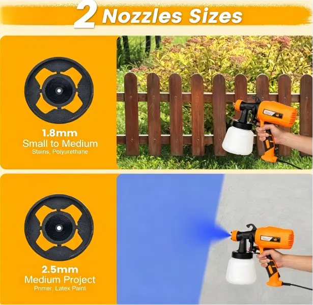 Ideal for home DIY projects, this sprayer is perfect for furniture, walls, fences, and cabinets. It comes with 2 nozzles (1.8mm, 2.5mm) and 3 spray patterns (horizontal, vertical, circular). This versatile tool ensures precise paint control on various surfaces.