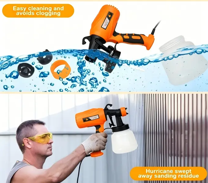 This sprayer helps remove debris before painting. Quick cleaning is made easy with a faucet adapter, cleaning needle, and brush. Tool-free assembly makes it beginner-friendly. The adjustable flow knob allows for precise paint control.