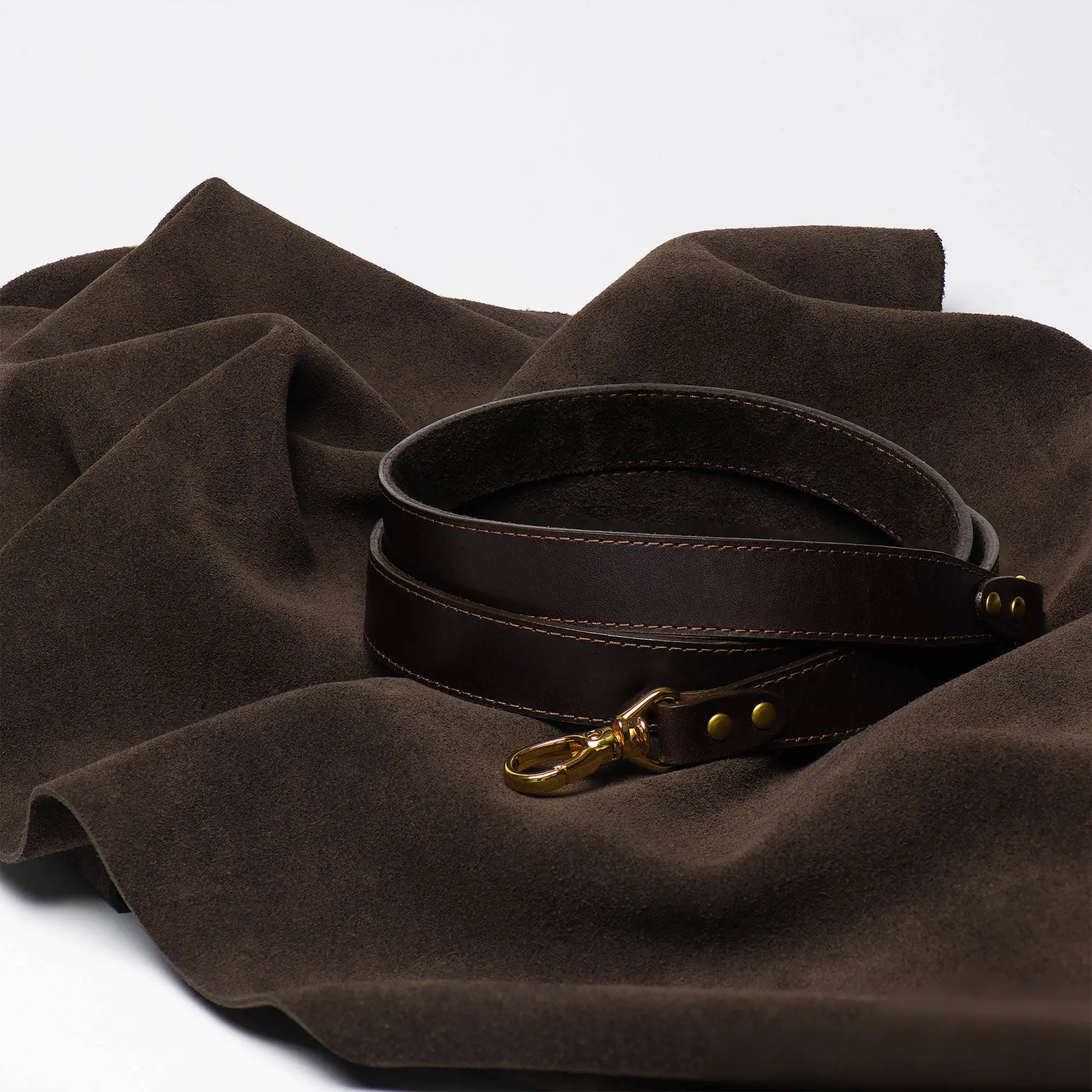 Dark Brown leather top and soft suede lining for comfort. Metal hardware in 3 tone colors. Silver, Gold, and Antique Brass. Wrist to Crossbody lenghts.