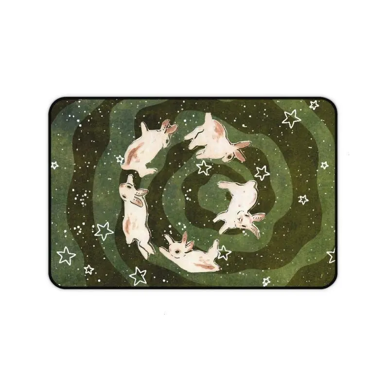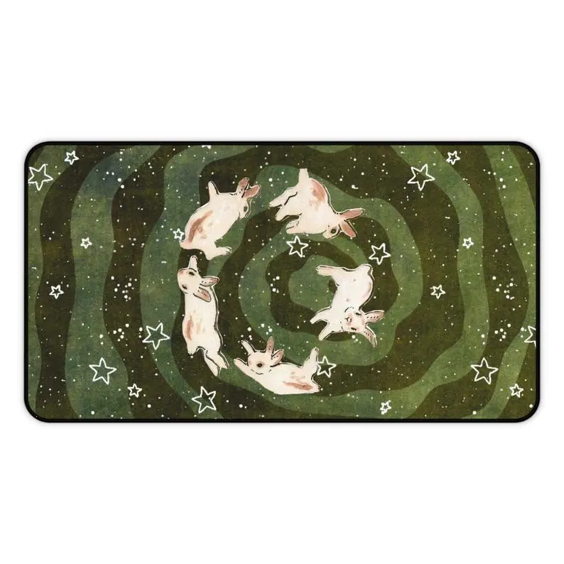 [SALE UP TO 50% + FREE SHIP] Whimsical Bunny Starry Night Desk Mat Mouse Pad Green Cosmic Spiral Design Large Gaming Setup Cute Animal Aesthetic Decor