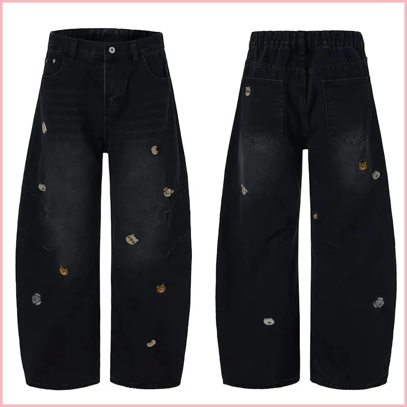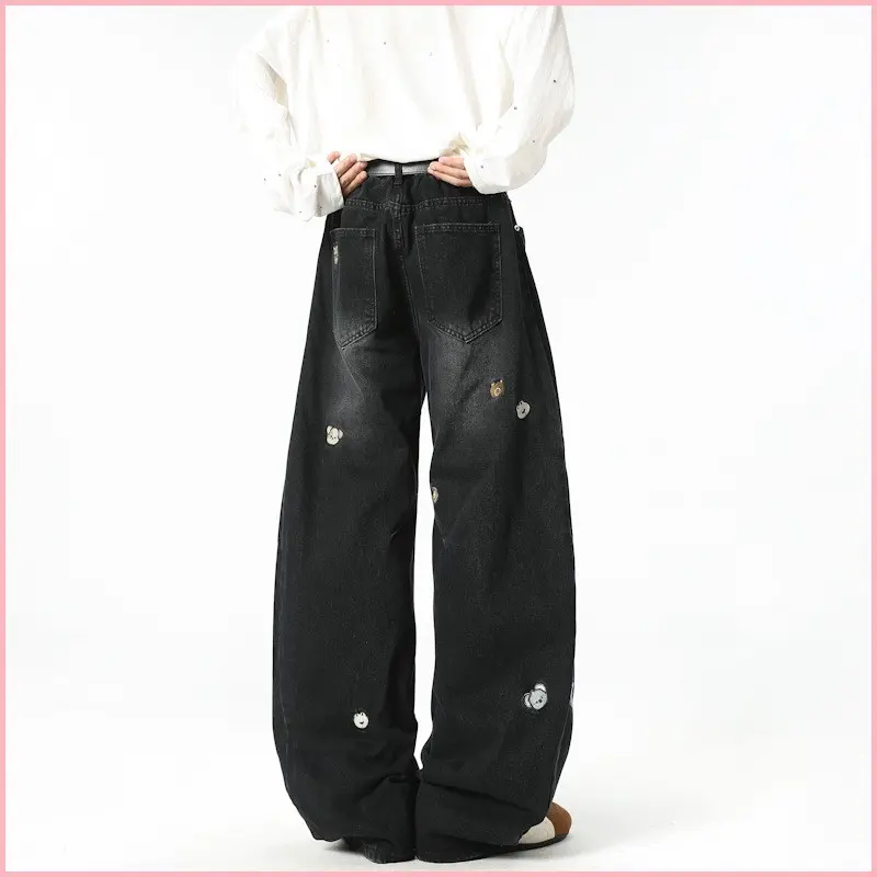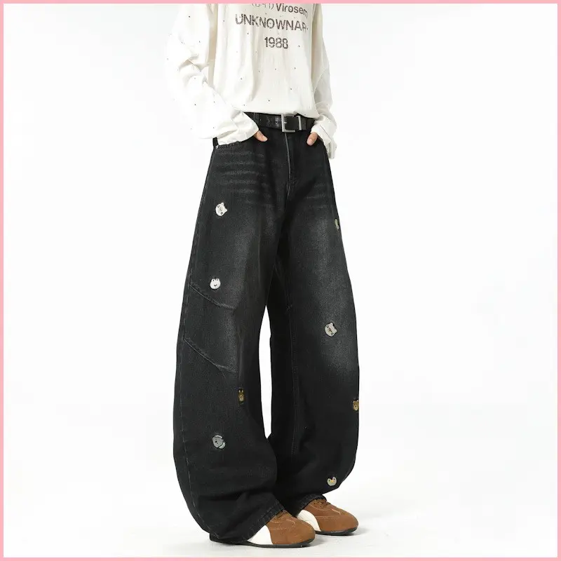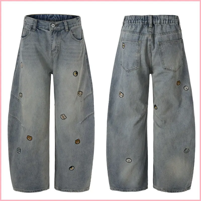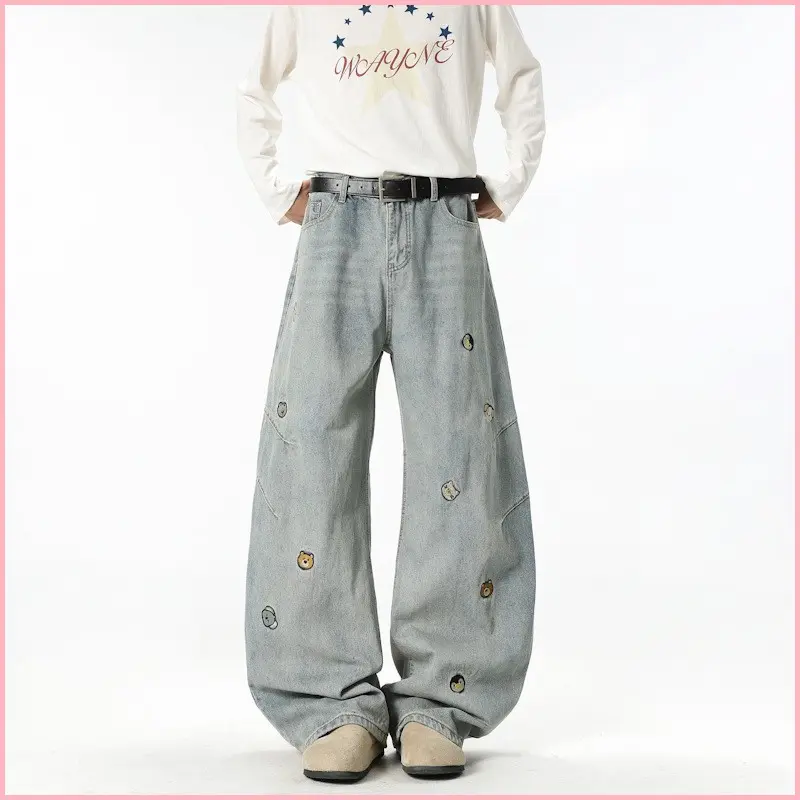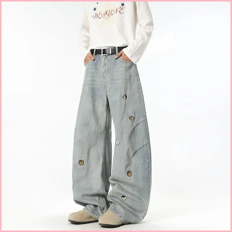 American High Street Trendy Brand Cartoon Embroidered Versatile Distressed Scimitar Pants Wide Leg Pants Straight Jeans