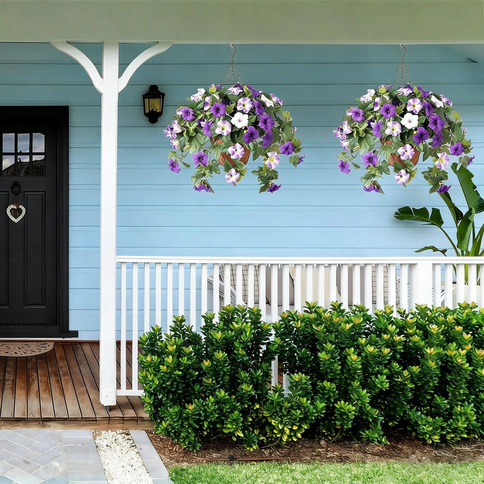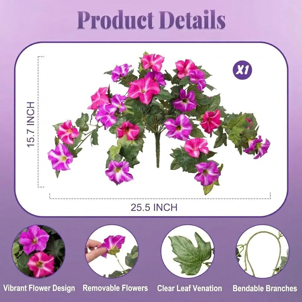 Each pack includes 1 bundle of artificial petunias (basket not included).Each stem measures approximately 25.5" * 15.7", with a flower head diameter of 2.7".Lush green leaves and full, dense blooms create a full, gorgeous look.