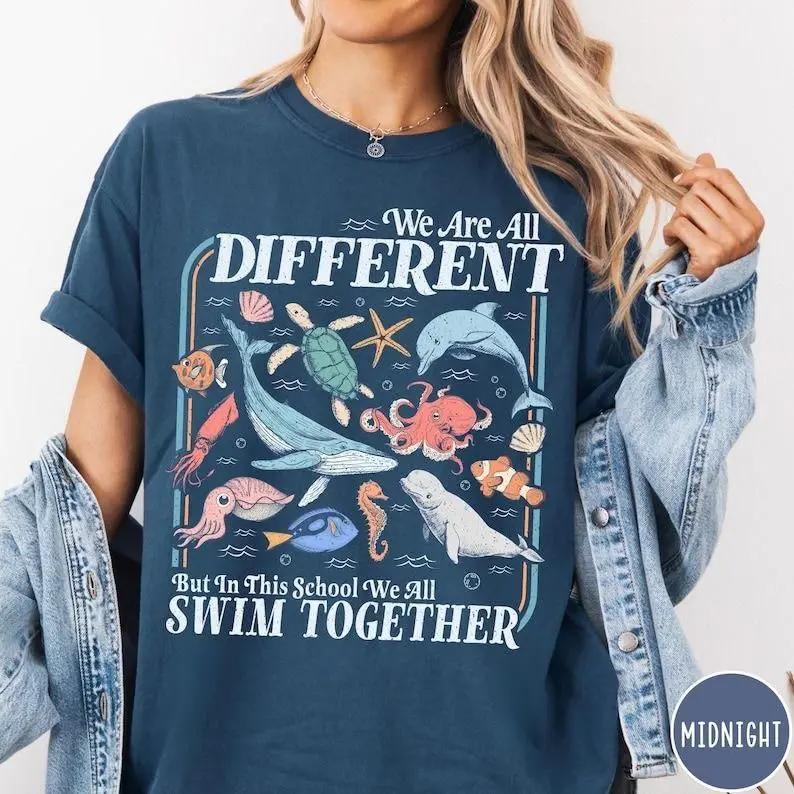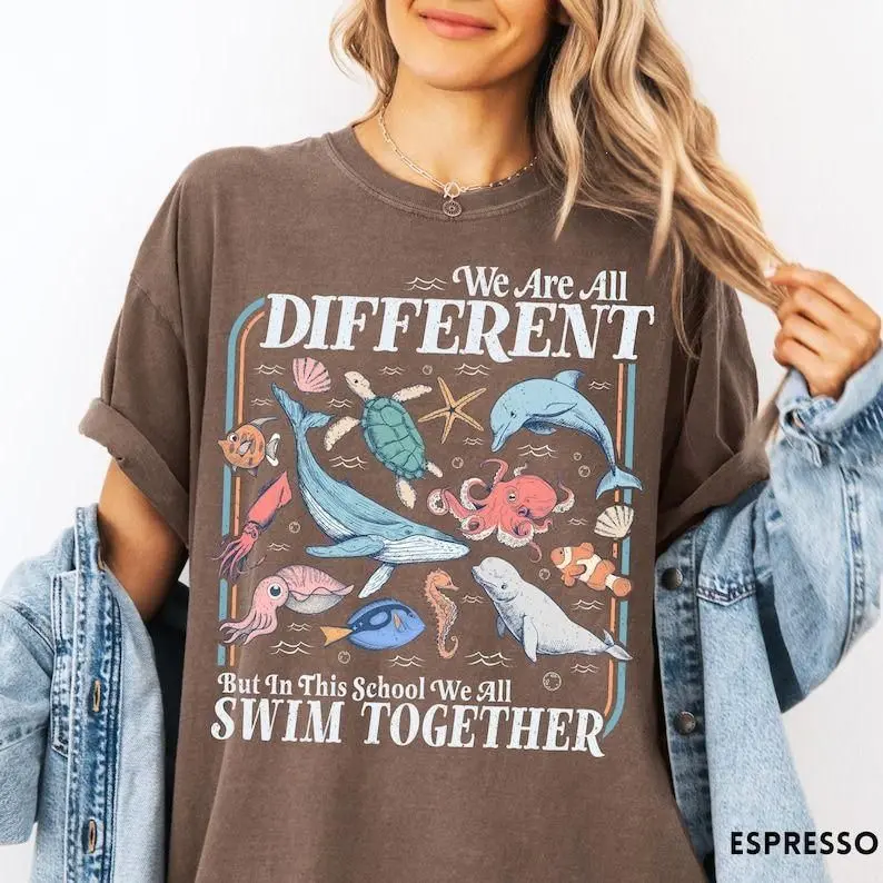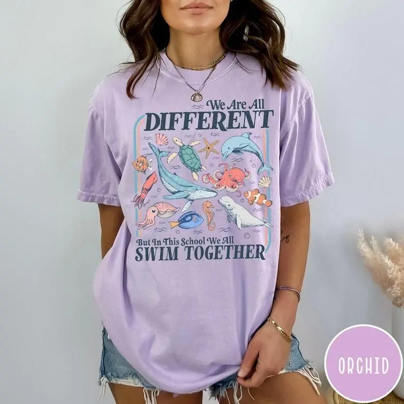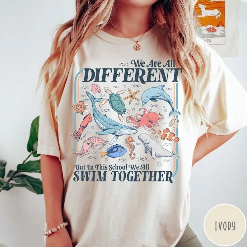5. We All Swim Together Shirt, School Teacher Shirt, Ocean Animal Classroom Tshirt, Kindness Graphic Tee