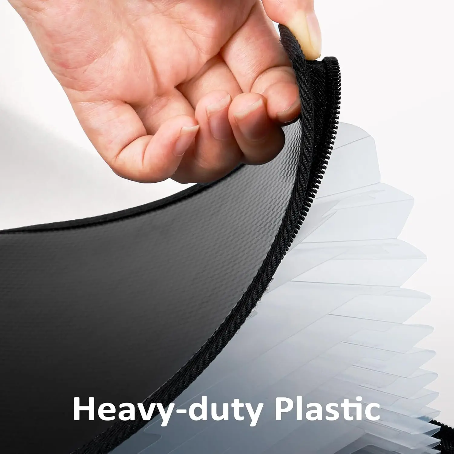 This reinforced plastic accordion folder is perfect for A4 letter size documents. It features 13 pockets for easy storage and retrieval. The zipper expanding design ensures your files stay secure and organized. Ideal for portable use, this black folder keeps your documents neatly arranged.