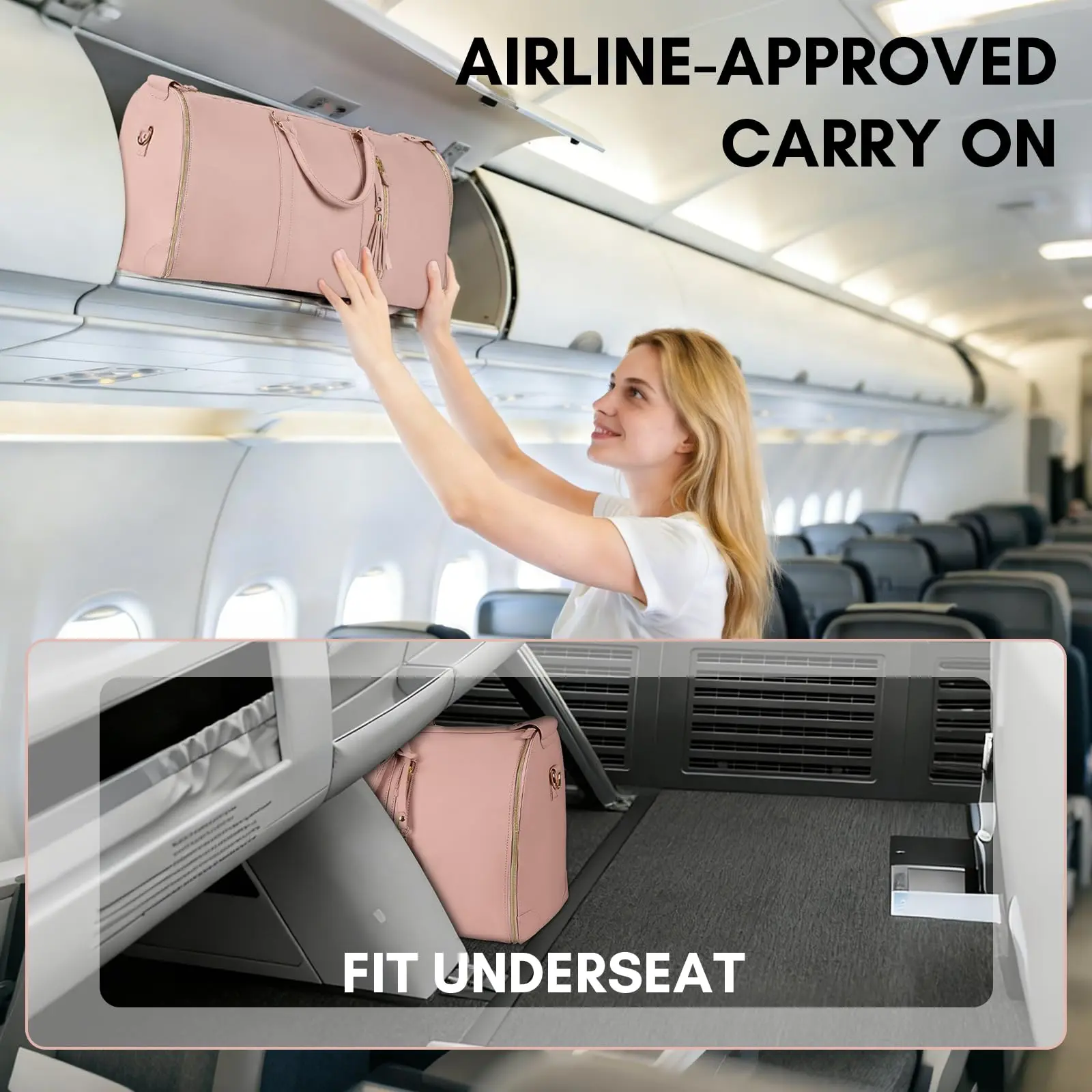 ✨ LARGE CAPACITY: This garment bag fits 2-3 days of essentials: clothes, dress, shoes, toiletries, cosmetics, and an umbrella. It includes two inner zipper pockets and an external zippered front pocket for your phone, IDs, or passport. An additional shoe pouch is included. Ideal for women, it's a great gift for travel enthusiasts.