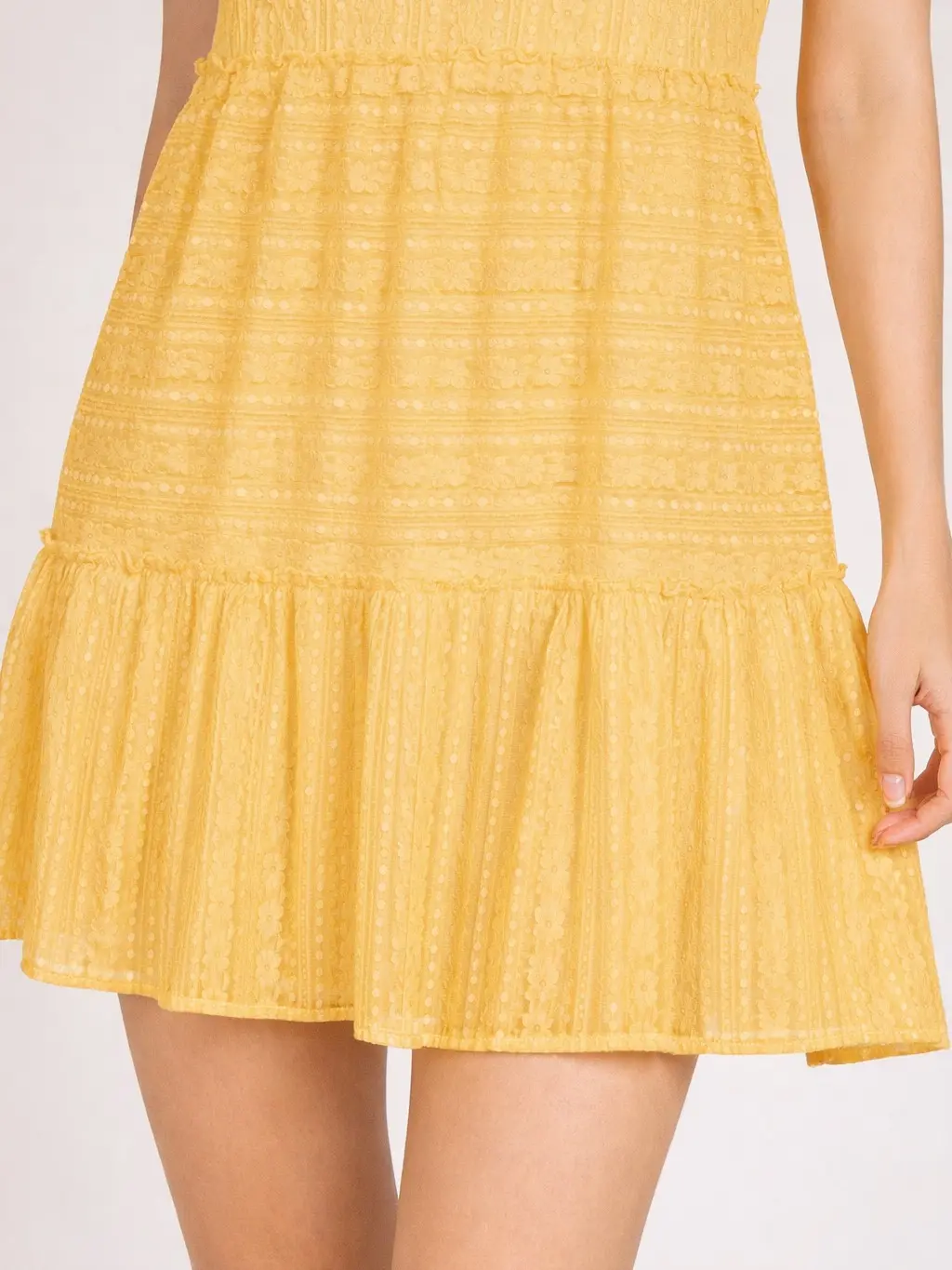Fresh, feminine, and easy to wear, this butter yellow mini dress brings a soft sunny feel to your warm-weather wardrobe. Designed with a delicate ruffle neckline, sleeveless shape, textured allover fabric, and a relaxed tiered silhouette, it creates an effortless look that feels playful, flattering, and easy to style for everyday outings.