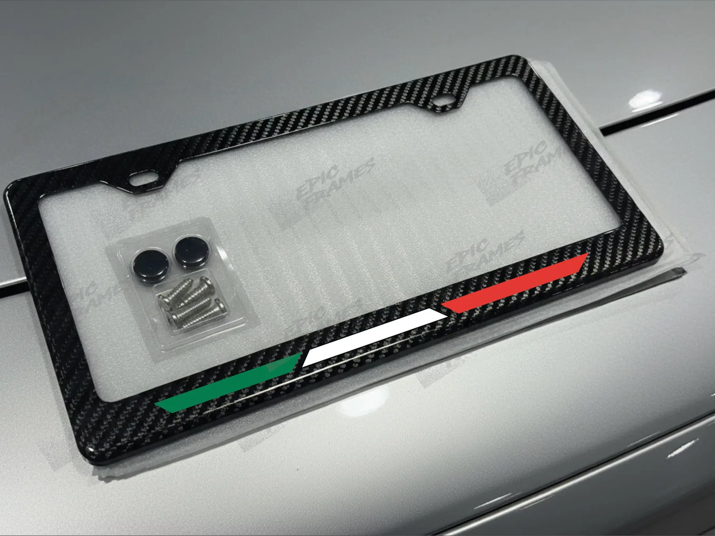 1X Italian Flag Colors Racing Style Carbon Fiber License Plate Frame. Screws and Caps Included.