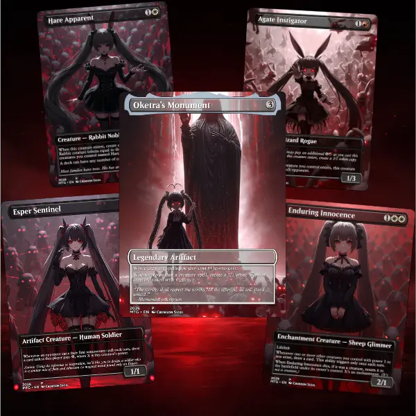 Step into a surreal fairytale nightmare with Arabella – The Hare Apparent, a twisted Commander deck where elegance meets madness. This MTG Proxy deck (100 Cards + Tokens) is reimagined with a dark doll-like aesthetic, haunting porcelain beauty, and eerie storybook fantasy. Every card is redesigned with soft yet unsettling tones — cracked porcelain skin, stitched fabrics, floating ribbons, and dreamlike environments that blur the line between innocence and horror.